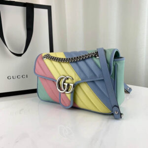 Pastels push the color focus throughout the Pre-Fall 2020 collection. in soft. vibrant hues. Made in matelasse chevron leather with a heart on the back in a stripes of light yellow. green. blue and pink. the now recognizable small GG Marmont chain shoulder bag has a softly structured shape and a flap closure with Double G hardware. Designed to be worn multiple ways. the chain strap slides to change between a shoulder and a top handle bag.