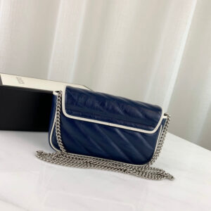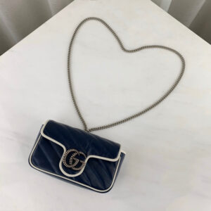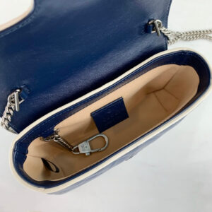 The GG Marmont bag is reimagined in blue diagonal matelasse quilted leather. trimmed with contrast white piping. The small accessory is completed with a textured version of the Double G??a contemporary take on an archival detail from the ’70s.