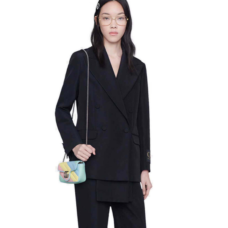 This GG Marmont bag is defined by its super mini shape. softly structured feel and a simple flap closure. The now recognizableDouble G defines the line?Ca three-dimensional detail inspired by an archival design from the ’70s. Made in matelasse leather with a chevron design. pastels push the color focus throughout the Pre-Fall 2020 collection. in soft. vibrant hues.