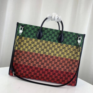 Embracing the new possibilities that lie within variations of the Gucci archives, various pieces throughout the collection provide a new lens through which to view the emblematic GG rhombi motif. Already an evolution of the House logo, it is once again reimagined in a series of bright colours—a theme that has become synonymous with the Creative Director’s vision. This large tote bag is part of the GG Multicolour collection.