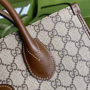 Designed in a structured shape. this small tote bag is crafted from GG Supreme canvas with brown leather trim. the small size double-handled silhouette has a top handle and shoulder strap.