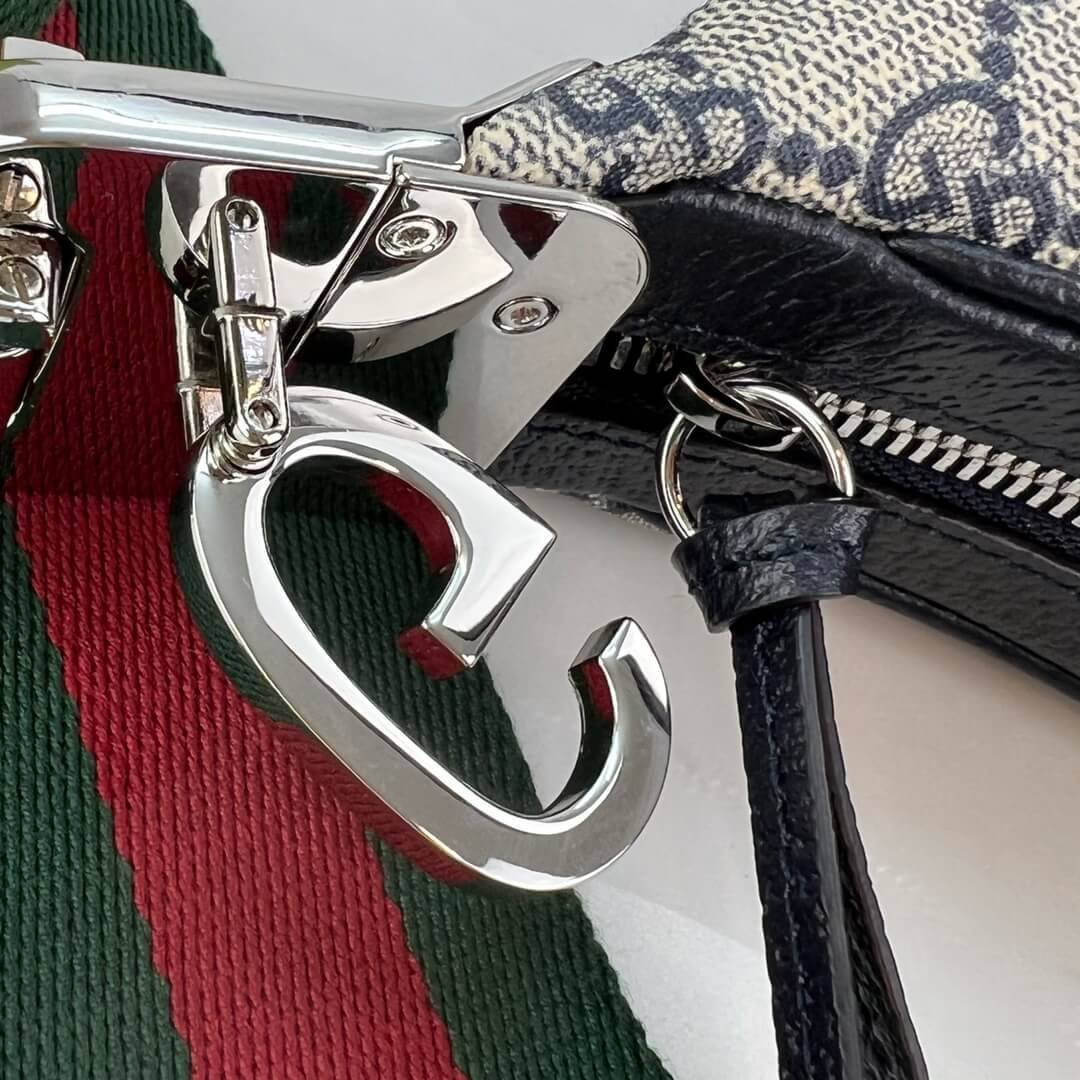 An ode to the timeless Hollywood glamour that shaped Gucci Love Parade, classic elements from the House’s archives are reintroduced. Distinguished by its crescent moon shape, the accessory is further defined by a G shaped hook closure. Paired with soft materials, the heritage hardware creates a refined design with vintage appeal. This small version is crafted in beige and ebony GG Supreme canvas with brown leather trim.