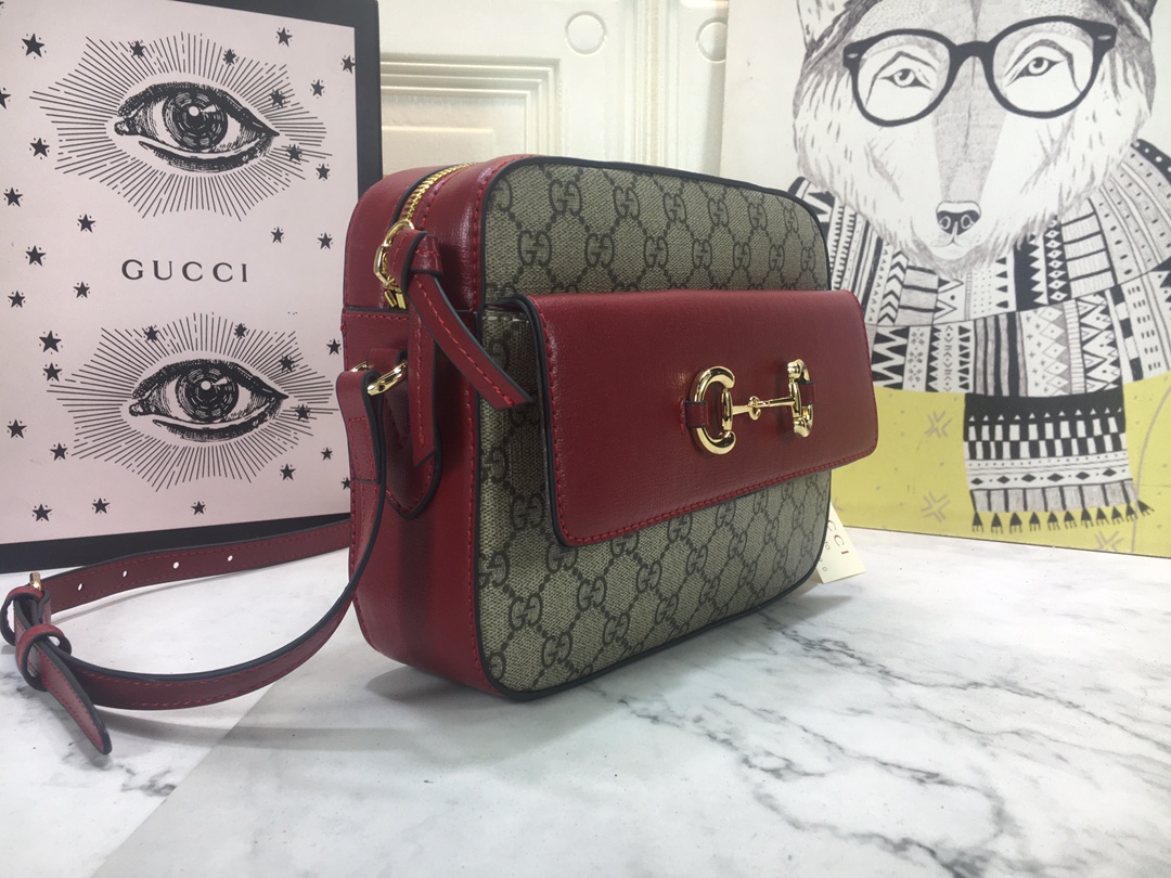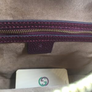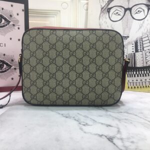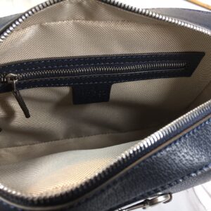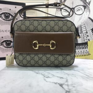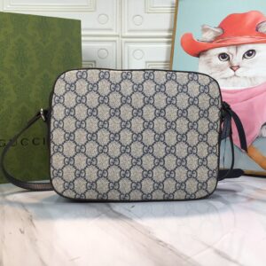 The Gucci Horsebit 1955 small bag comes in five colors and is a timeless piece that is perfect for any occasion. Measuring 22.5 x 17 x 6.5 cm. this bag is made of beige and blue GG Supreme canvas. a material that has a low environmental impact. The bag also features blue leather trim and gold-toned hardware. giving it a luxurious look. The microfiber lining has a suede-like finish. adding to the bag’s elegance. The front of the bag has a horsebit detail. which is a signature of the House. The interior of the bag has a zip pocket. and there is also a front pocket for additional storage. The bag can fit a cell phone up to 3.1W x 6.6H x .4D. The shoulder strap has a 19.7?? drop. making it easy to carry. The bag weighs approximately .46kg. The GG Supreme canvas has a historic origin and has been used in collections for decades. The blue and beige mix of the canvas defines the classic palette of this small-sized Gucci Horsebit 1955 bag.