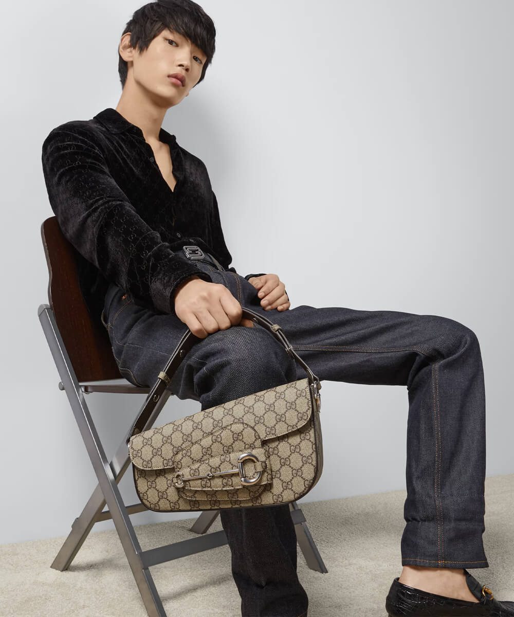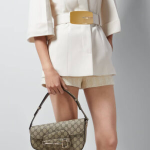 As the historic Horsebit hardware celebrates its 70th anniversary, the House looks at new ways of combining archival features with contemporary silhouettes. Introduced as part of the latest Cruise 2024 collection, this Supreme canvas Gucci Horsebit 1955 handbag is defined by an asymmetrical shape that lends a modern feel to the renowned line.