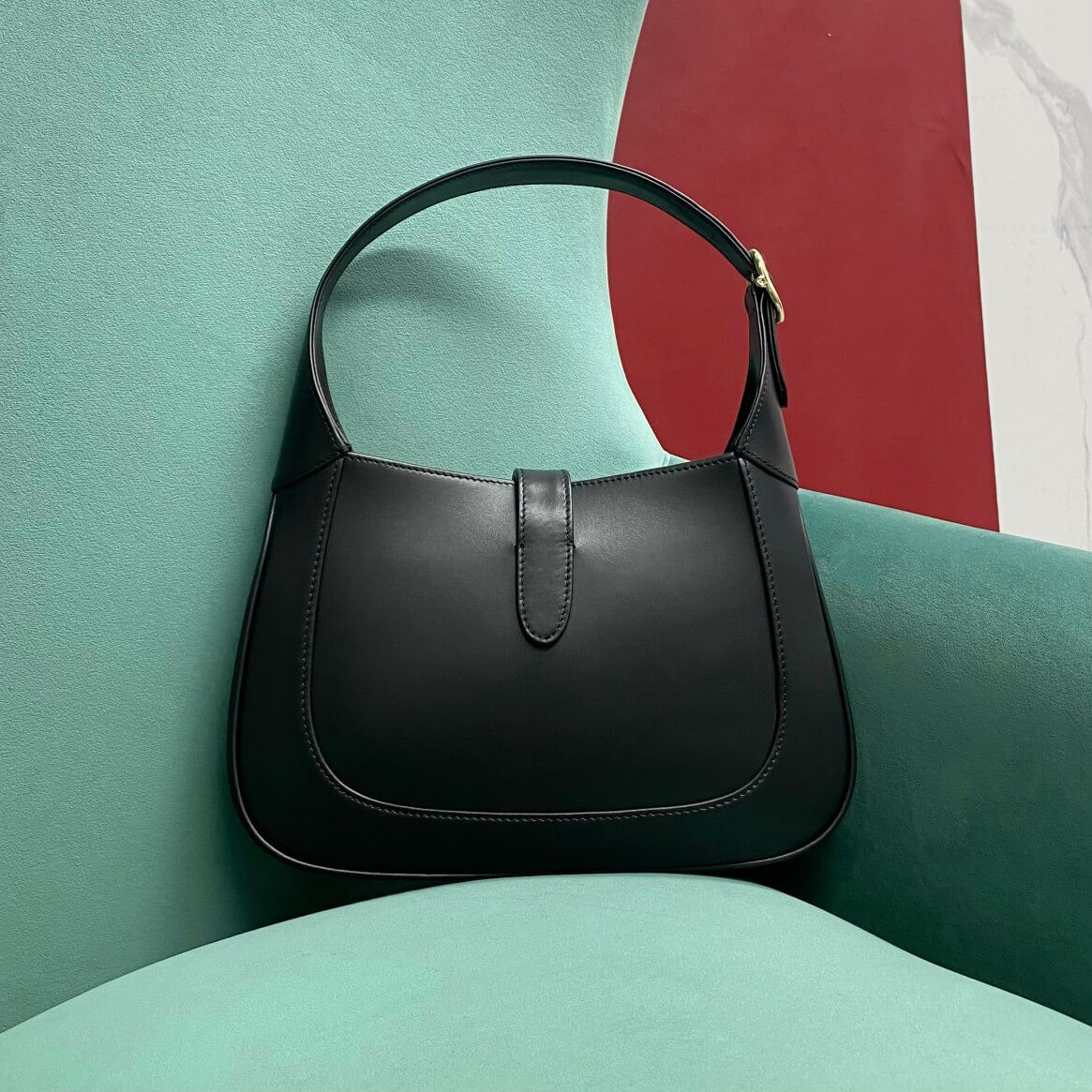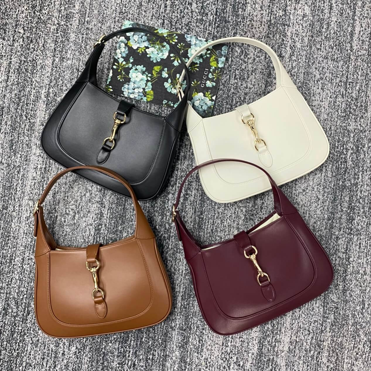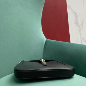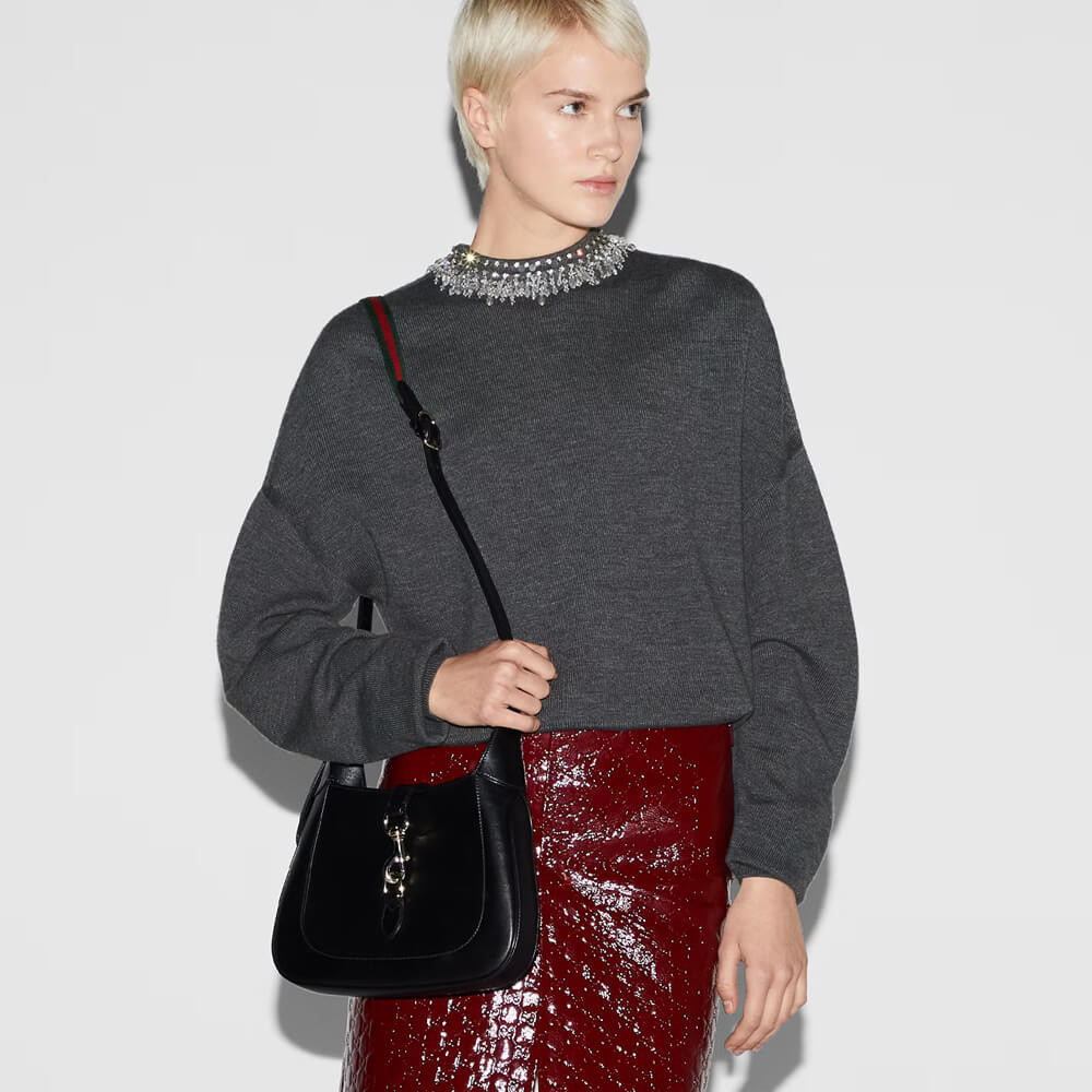 The new Gucci Jackie is crafted from premium fine leather which highlights the craftsmanship, crescent shape, and sleek silhouette of the House’s iconic shoulder bag. Light gold-toned hardware, leather trim, and an additional Web strap gives this Gucci Jackie small shoulder bag in light grey leather further styling options.