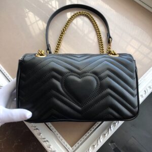 Introducing the stylish and versatile Gucci Marmont Small Matelasse Shoulder Bag. perfect for any occasion. Made from black matelass?? chevron leather. this bag features an eye-catching heart design on the back. antique gold-toned hardware. and the iconic Double G logo. The flap closure with a spring closure keeps your belongings secure. while the sliding chain strap can be worn as a shoulder or top handle bag for ultimate comfort and flexibility.