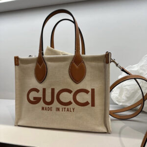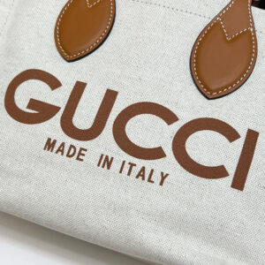 Well-known prints of the House constantly evolve to tell a unique narrative. An essential storytelling element of the Cruise 2024 collection, the ‘Gucci Made in Italy’ print defines this beige canvas tote bag with a light brown trim and GG Supreme lining.