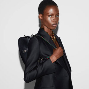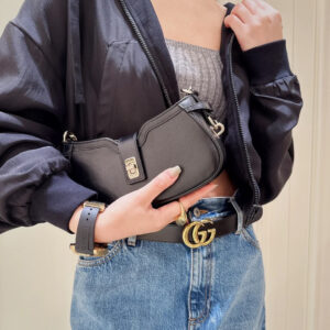 The Gucci Moon Side bag echoes the beauty of lunar-lit moments through its precise craftsmanship. This mini shoulder bag combines the Web with light gold-toned hardware. The green and red stripe shoulder strap is attached through a leather loop and hardware ring on the sides, which give the bag additional function and structure.