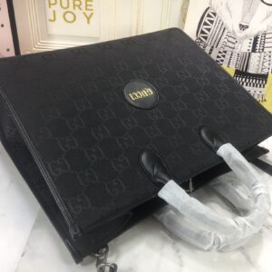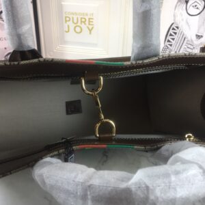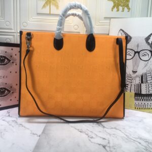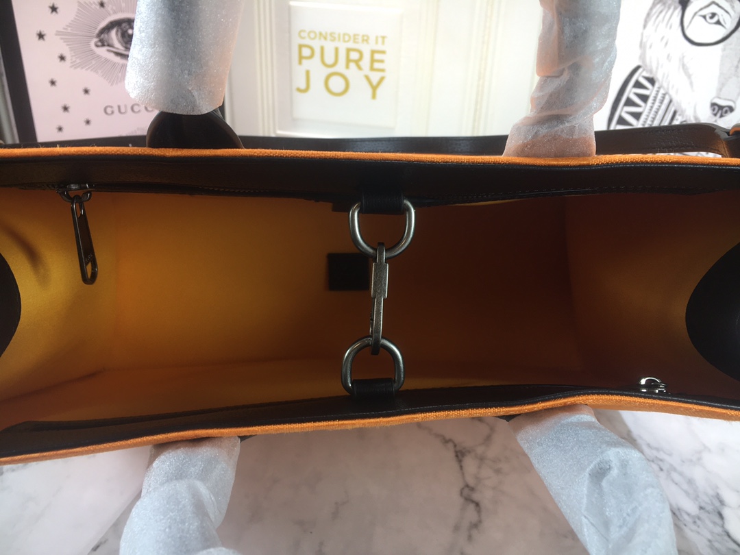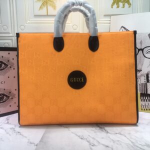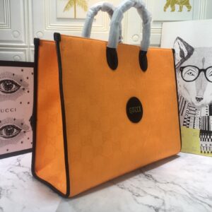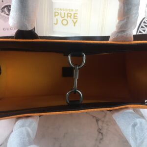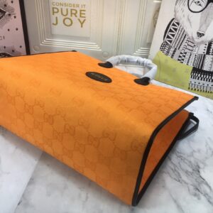 The tote bag comes in black. orange. and beige colors and has leather details with the Gucci script logo. It has two zipper pockets in the interior and two zip pockets. The tote bag has leather top handles with an 8cm drop and an adjustable leather shoulder strap with a 37cm drop that can be detached on one side and tucked into the bag.