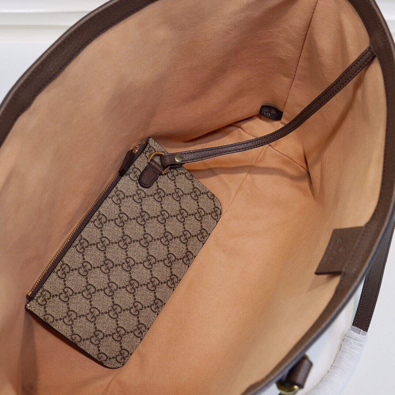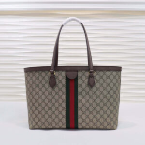 A classic combination of the House’s most defining codes??the GG motif and Web stripe??the world of Ophidia continues to evolve. incorporating new shapes and silhouettes each season. With recognizable design elements in a practical new shape. this new medium sized tote is trimmed with textured leather and topped with Double G hardware.