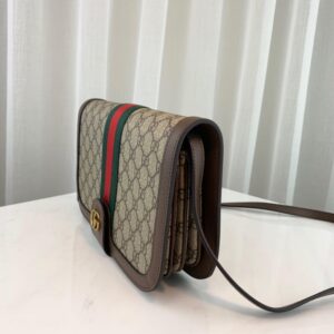 A classic combination of the House’s most recognizable elements??the GG motif and Web stripe??the world of Ophidia continues to evolve. incorporating new shapes and silhouettes. A versatile shape originally inspired by mail carriers. postmen. and bicycle couriers. the messenger bag became a popular item in ’80s urban streetwear. Here. the crossbody bag is crafted in GG Supreme canvas trimmed with textured leather and topped with Double G hardware.