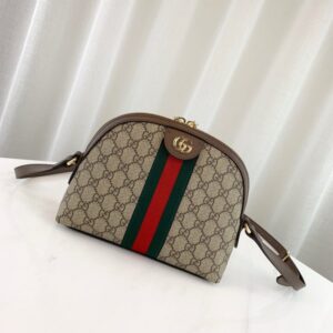 Crafted in GG Supreme canvas with inlaid Web stripe detail. the shoulder bag has a domed shape that recalls vintage designs. The Double G??an archival code??appears atop a leather tab detail and on the zipper pull.