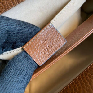 The Gucci Ophidia GG Small Shoulder Bag 503877 in Blue Denim is a vintage-inspired chain strap shoulder bag that is crafted in GG Supreme canvas with inlaid Web stripe detail. The bag has a structured shape that secures with a magnetic closure. which is trimmed with leather and Double G hardware??an archival detail. The bag measures 26 x 17.5 x 8 cm and is made of beige/ebony GG Supreme canvas. a material with low environmental impact. with brown leather trim. It features blue and red Web. gold-toned hardware. hand-painted edges. double gussets. and an interior open pocket. The chain shoulder strap has a 17″ drop. and the bag has a silk lining. The bag’s size is 10 W x 7 H x 3 D.