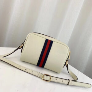 A white leather mini bag featuring the oval enamel Double G detail. The petite shape is further enhanced by the classic Web in blue and red. a link to the House’s equestrian roots. The world of Ophidia brings together emblematic Gucci codes with vintage inspired shapes.