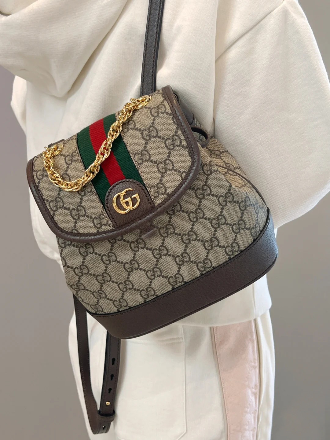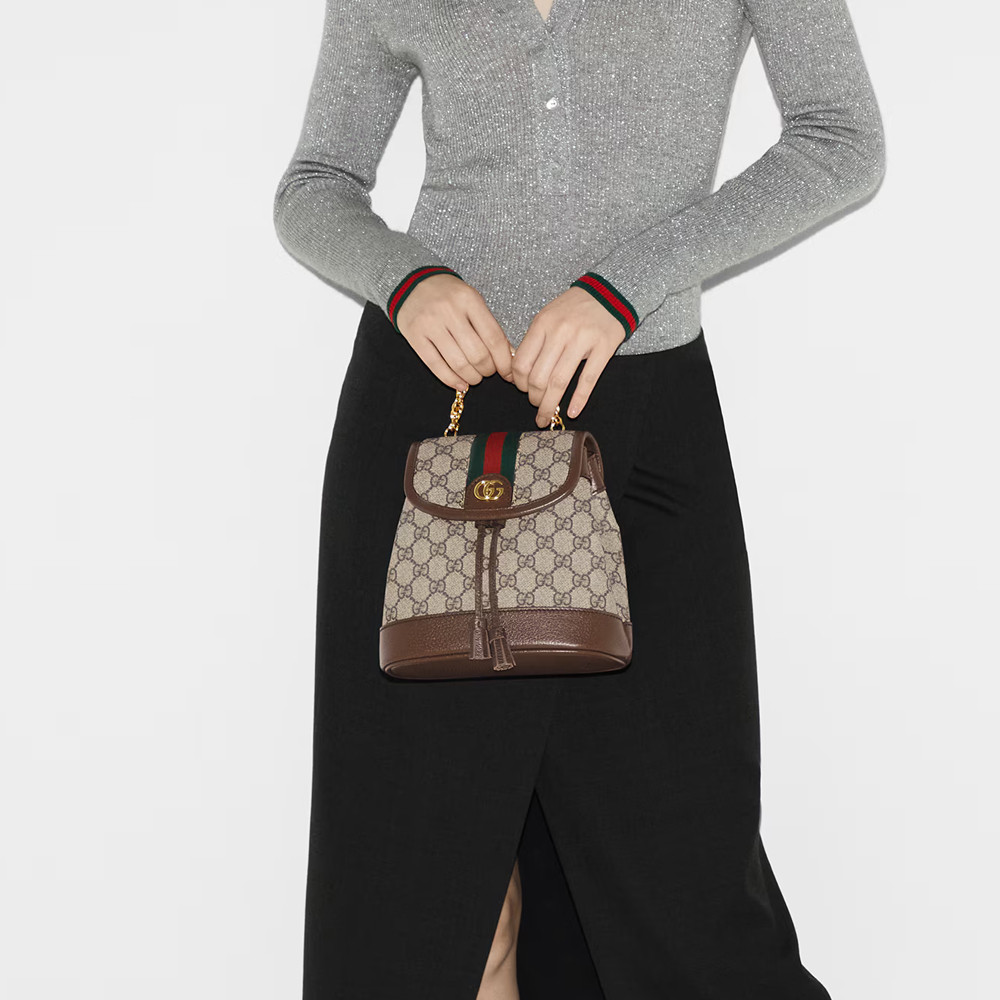 Gucci heritage meets contemporary design with the continuation of Ophidia. This backpack is presented in beige and ebony GG Supreme canvas, enriched with the historic Web. Adjustable shoulder straps complete the modern design.