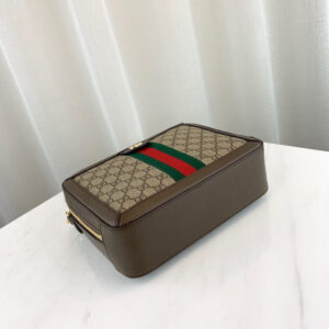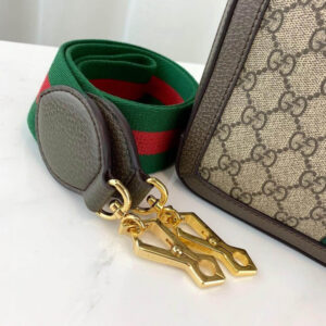 The world of Ophidia evolves with the introduction of a small shoulder bag with a leather top handle and detachable Web shoulderstrap. Crafted in GG Supreme canvas with inlaid green and red Web stripe. the accessory is enhanced by a petite play on the Double G. an archival Gucci code from the ’70s that appears atop a leather tab detail and on the zipper pull.