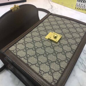Introducing the Gucci Ophidia small top handle bag with Web 651055. a stylish and environmentally conscious accessory. Made from beige and ebony GG Supreme canvas. a material with low environmental impact. this bag features brown leather trim and shiny gold-toned hardware. The green and red House Web stripe adds a pop of color to the vintage-inspired square shape. which is accentuated by the Double G hardware. The microfiber lining with suede-like finish and internal zip and open pockets provide ample storage space. The inserts contain leather made through an alternative metal or chrome-free tanning process. reducing the environmental footprint compared to traditional methods. This small-sized bag can fit a cell phone up to 3.1W x 6.6H x .4D and comes with a handle with 4?? drop and a detachable shoulder strap with 19?? drop. The magnetic closure ensures your belongings stay secure. Weighing approximately .7kg. this bag is made in Italy and is part of the Epilogue collection. The model is 5’5?? tall. Upgrade your accessory game with the Gucci Ophidia small top handle bag with Web 651055.