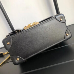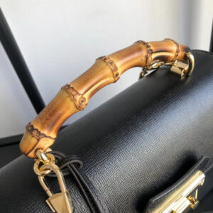 Archival details. including the bamboo handle and closure. combine in a modern silhouette in the small shoulder bag. crafted from textured black leather. The structured shape has a flap closure that locks with a key kept in a removable leather holder. The top handle shape is further enriched with a removable chain and leather shoulder strap.