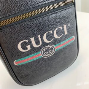 A down-sized version of the messenger bag introduced in Pre-Fall 2018. the leather shoulder bag is crafted from textured black leather printed with the Gucci logo. The distinctive trademark appears on the front of the bag??an eighties inspired motif that encompasses the House name with the Web and Interlocking G. An adjustable leather shoulder strap. front pocket and zipper closure complete the style.