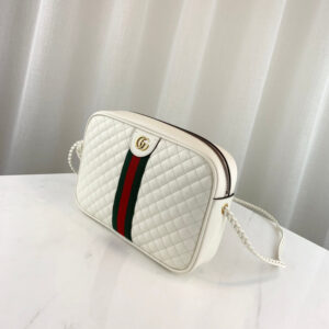 The small leather shoulder bag in quilted leather mixes a sportswear feel with distinctive emblems of the House. The shiny leather is contrasted with the traditional green and red Web stripe and Double G hardware.