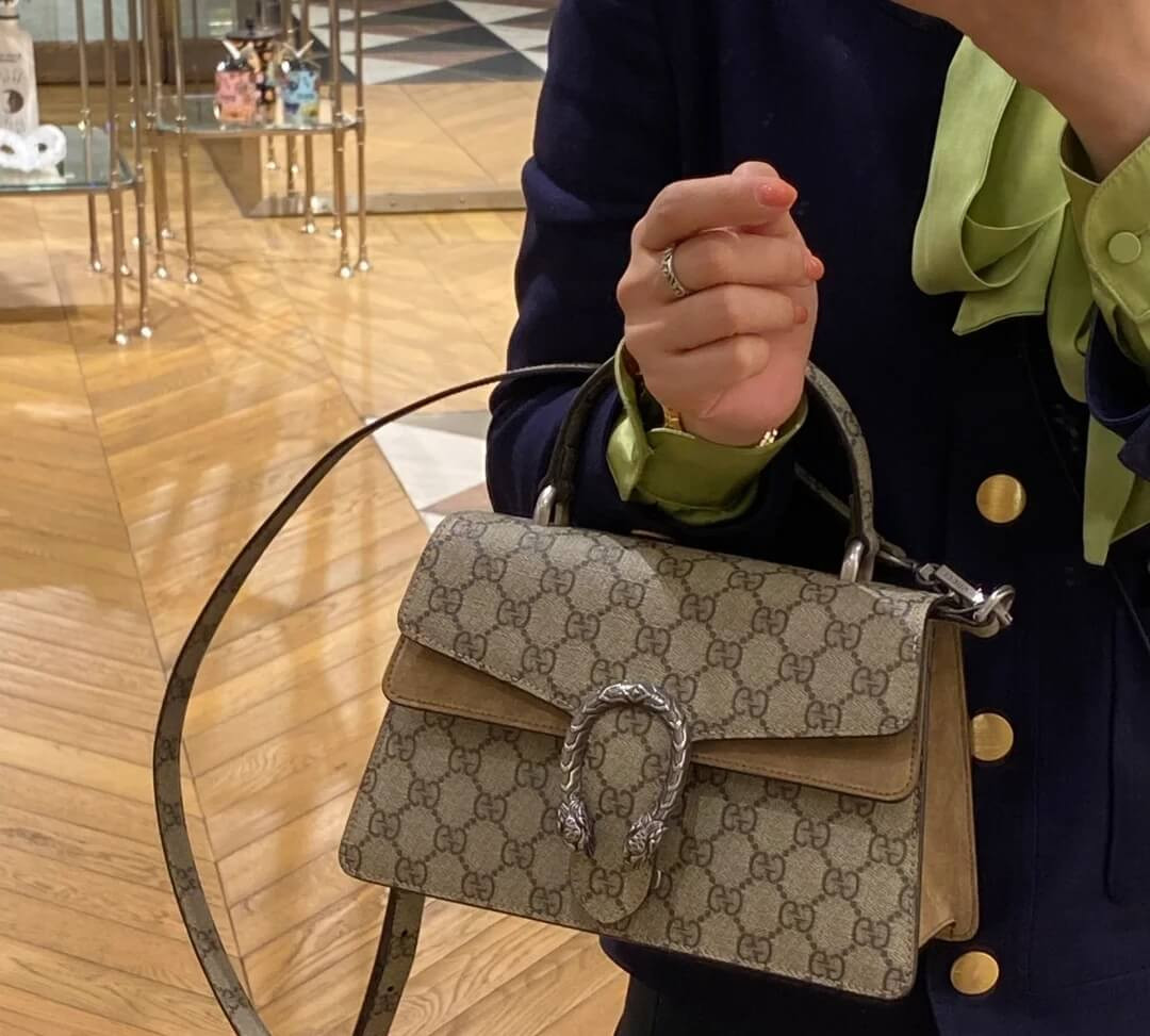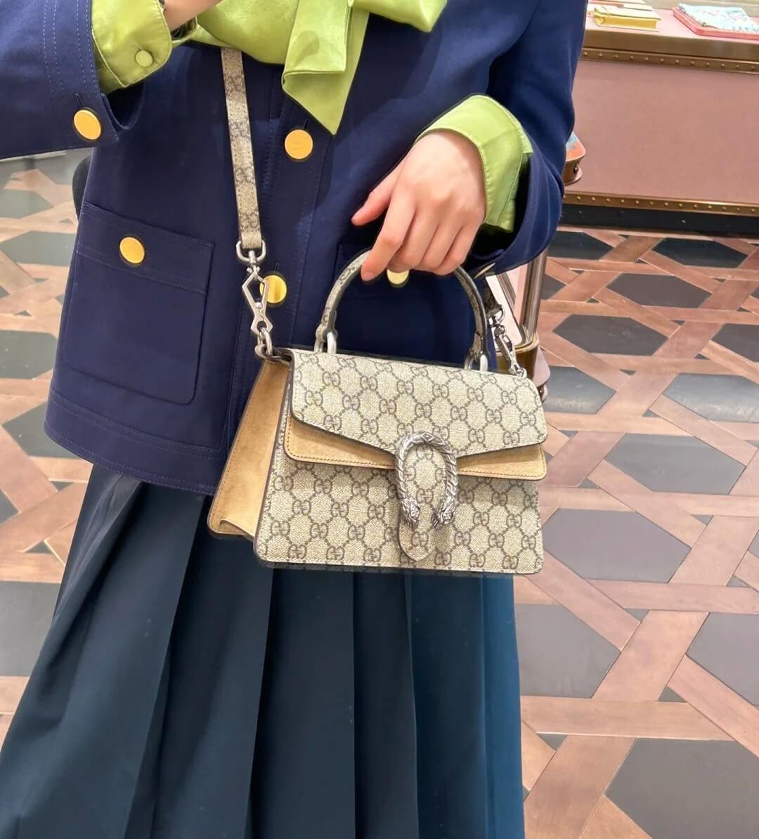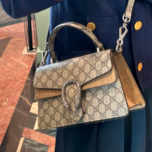 A structured GG Supreme canvas top handle bag appears beige and ebony with subtle taupe suede trim. The textured tiger head closure defines the front as a unique hardware detail.