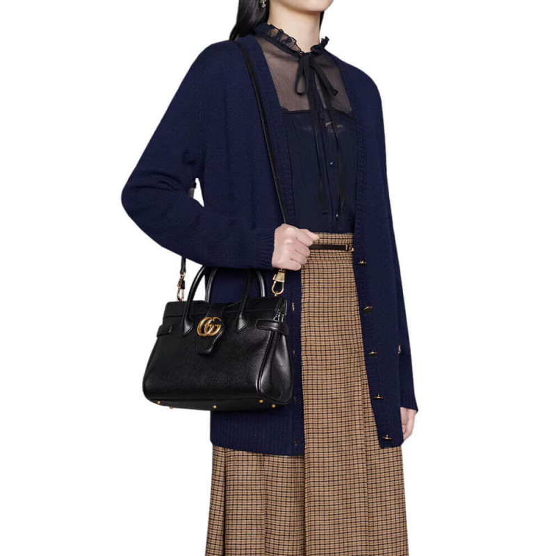 Taken from the ’70s archives. the Double G recalls one of the heydays of the House. The hardware first appeared as a monogram belt buckle but has evolved into one of the brand’s most emblematic codes. Here. the gold-toned detail defines a top handle bag in black leather. A detachable shoulder strap adds a versatile note to the style.