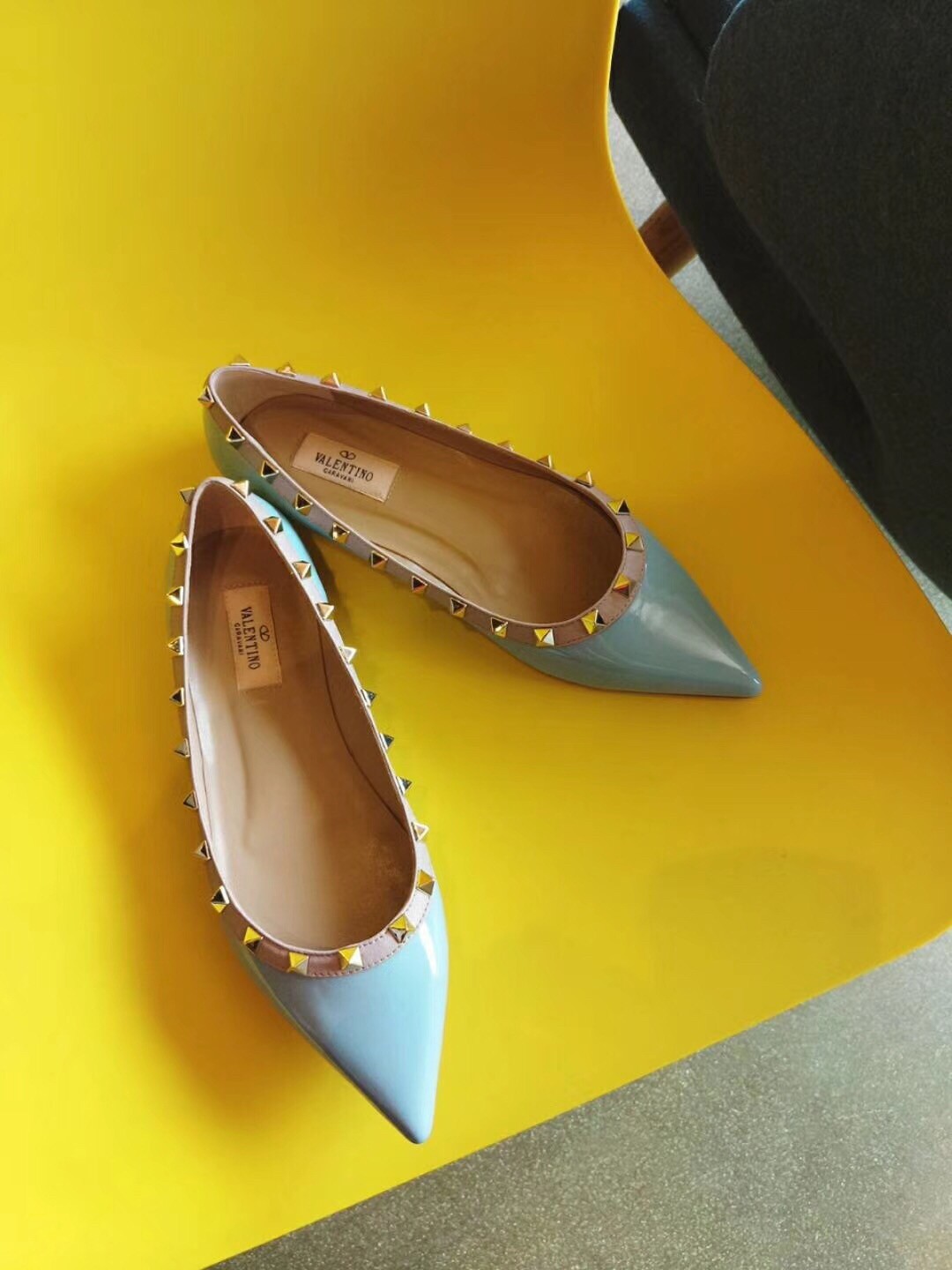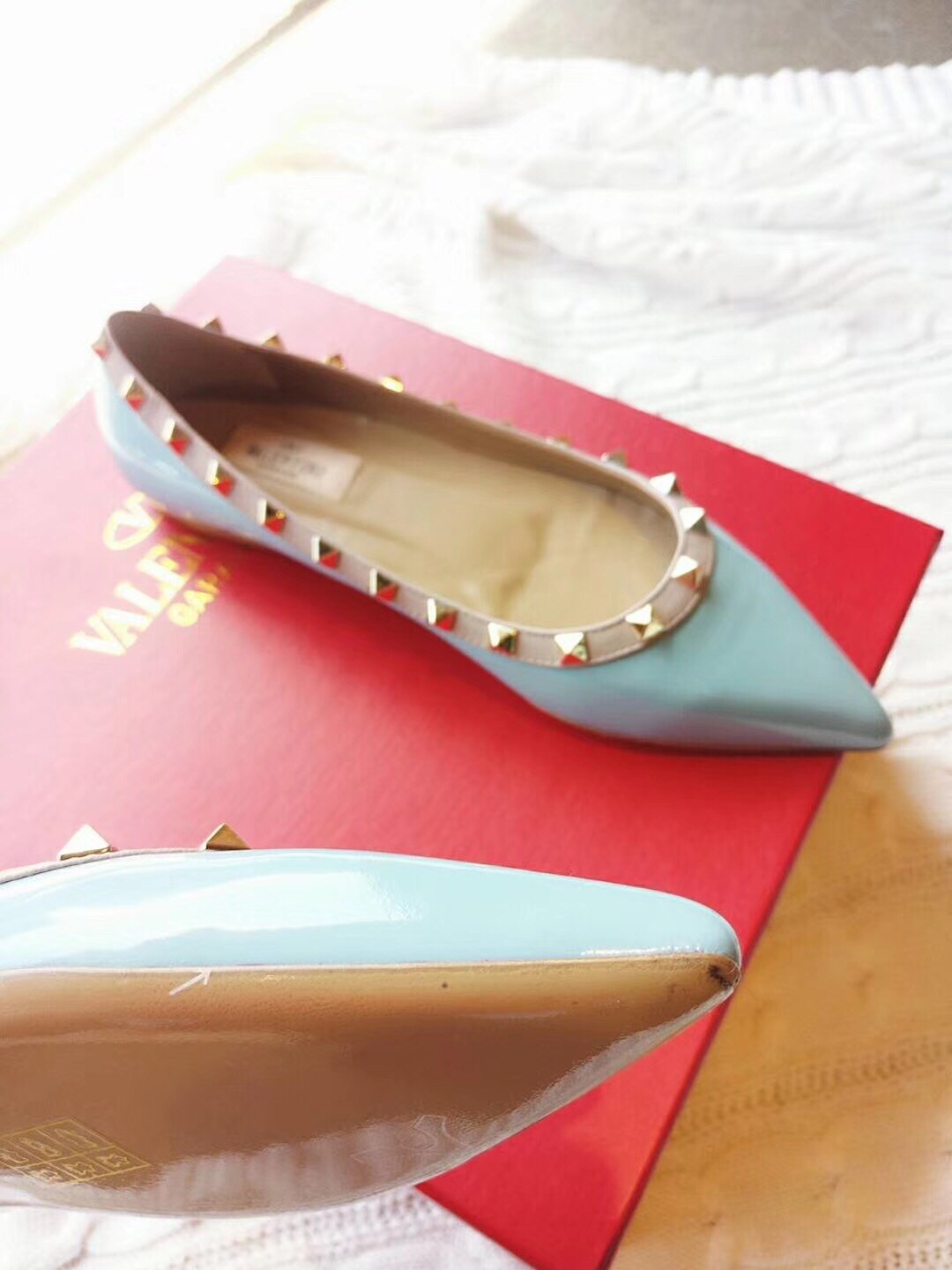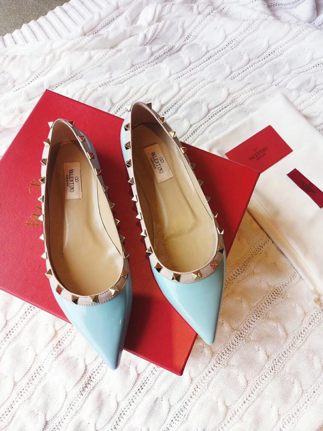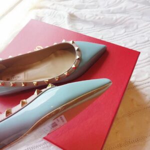 Valentino Rockstud Ballet Flats In Light Blue Patent Leather