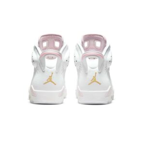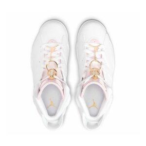 The women’s Air Jordan 6 Retro ‘Gold Hoops’ adds gilded accents to the shoe that Michael Jordan wore when he clinched his first ever NBA championship. The vintage mid-top carries a white tumbled leather upper with Barely Rose hits on the tongue, heel tab and midsole, fitted with a visible Air-sole unit in the heel. Metallic gold lace locks are matched by a trio of earring-inspired gold hoops, with a Jumpman charm attached to the lowest ring via a short gold chain. Underfoot, milky translucent rubber is utilized on the outsole.