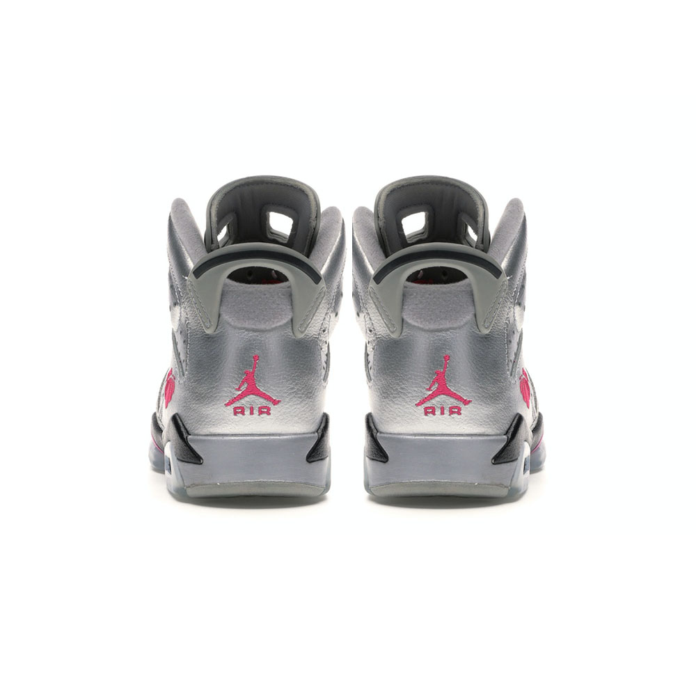 The Air Jordan 6 Retro GG ‘Valentine’s Day’ is an all-silver take on the classic kick. Released in women’s sizing, the shoe features pink and black hits around the body of the shoe, pink laces, an embroidered heart and basketball logo, and a matching pink Jumpman logo on the heel.