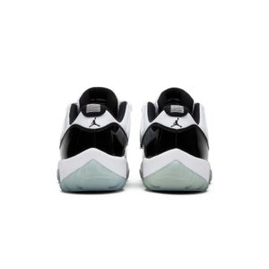 The Air Jordan 11 Retro Low ‘Concord’ reimagines the iconic OG colorway as a sleek low-top. The material build is faithful to the 1995 original, featuring a white ballistic mesh upper with a contrasting black patent leather overlay. A plush Phylon midsole is fitted with full-length Air sole cushioning and reinforced with a springy carbon fiber plate. The latter is visible through an icy translucent outsole, enhanced with purple herringbone rubber traction pods that give the shoe its name.
