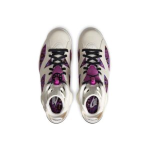 The Air Jordan 6 “Quai 54 – Purple” was released by Jordan Brand in 2020 to coincide with the annual streetball tournament in Paris, France. One of two “Quai 54” colorways of Michael Jordan’s sixth signature shoe, this design displays a Sail leather base with underlying patterned textile panels with purple, orange, and black accenting on either side. Black embroidered Jumpman branding can be found on the purple nylon overlay on the tongue. Jordan Brand opts for a purple lace toggle with mini black Jumpman detailing and co-branded “Nike Air” and “Quai 54” embroidery on the left and right heel, respectively. A clear Air unit is encased within the heel for a timeless appearance. Release date: July 2020.