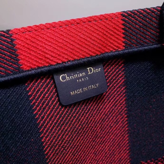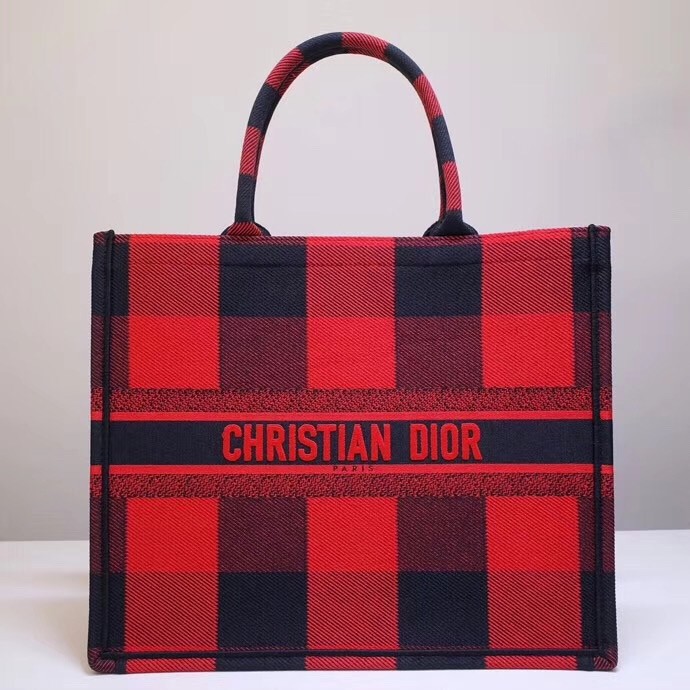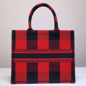 Dior Book Tote Bag In Red/Black Check Embroidered Canvas