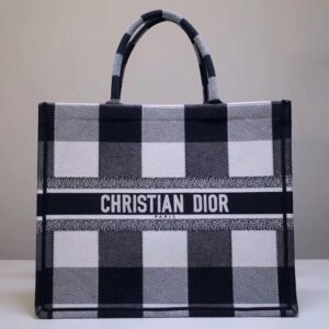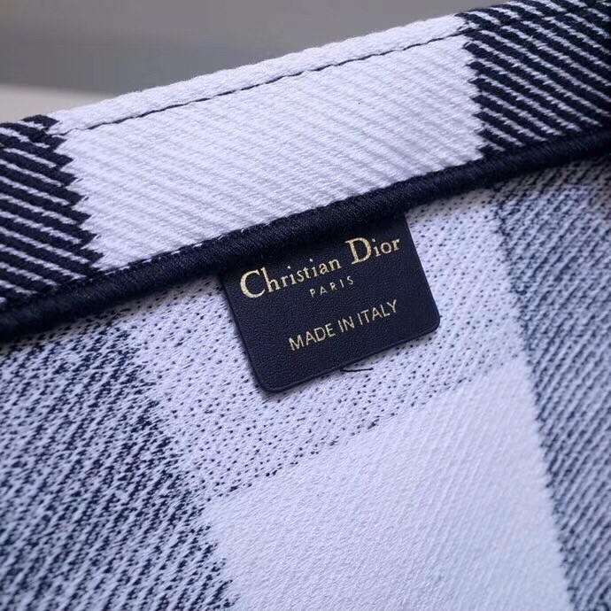 Dior Book Tote Bag In White/Black Check Embroidered Canvas