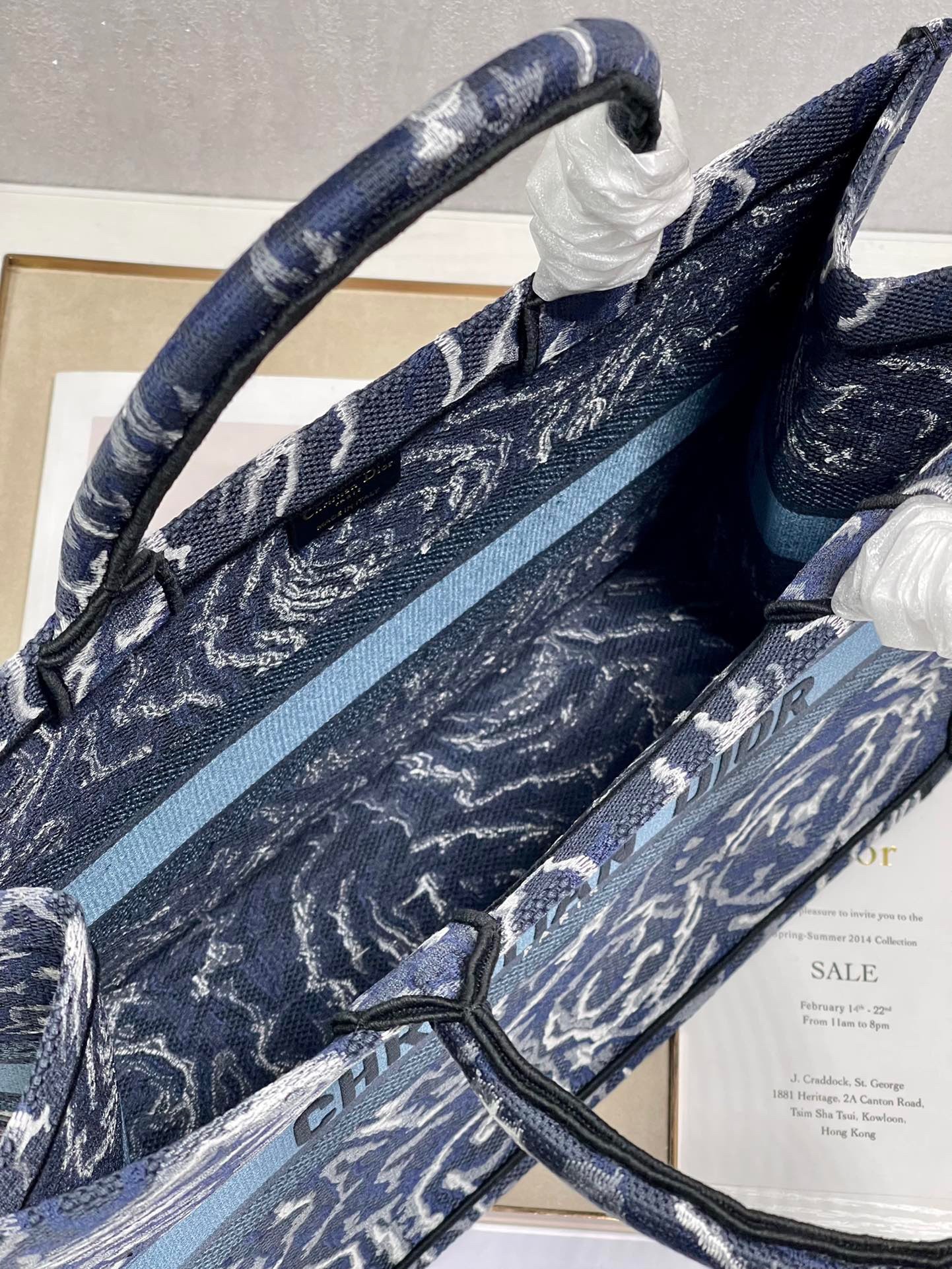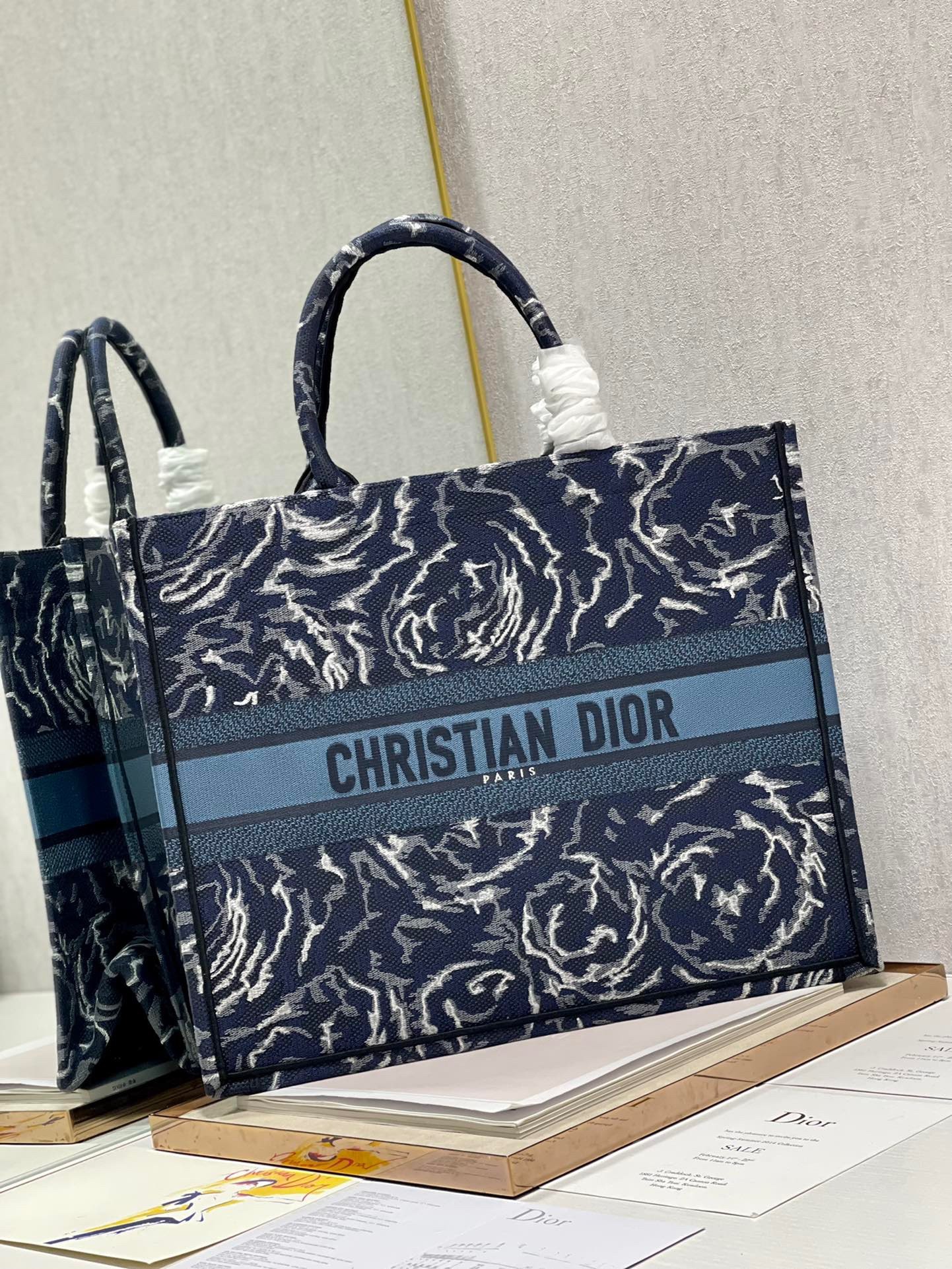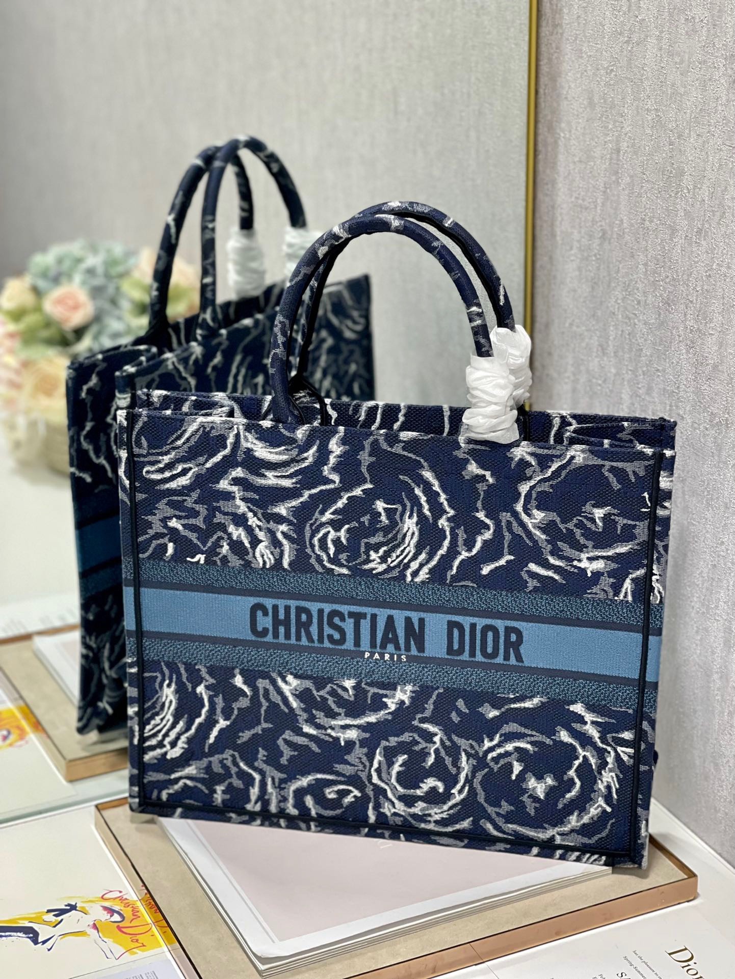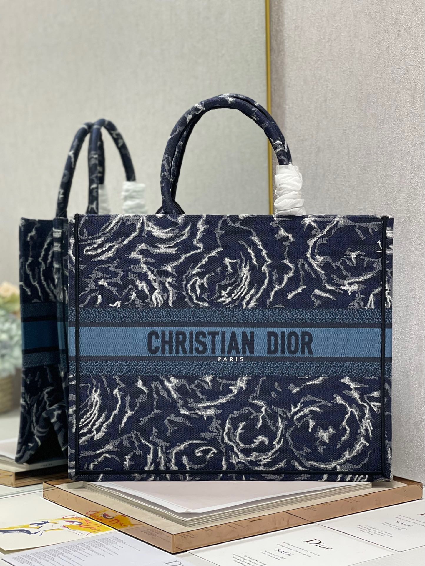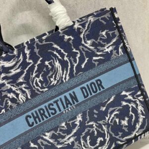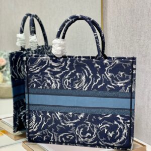 Dior Large Book Tote In Blue Dior Roses Embroidery