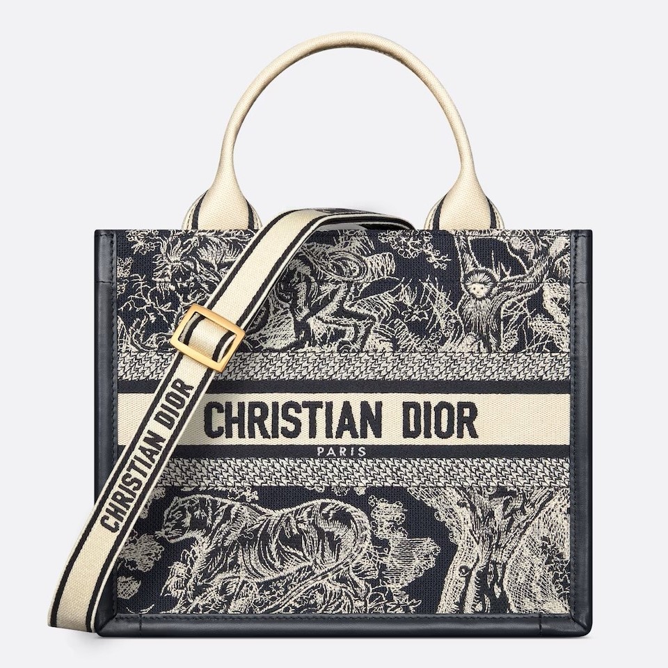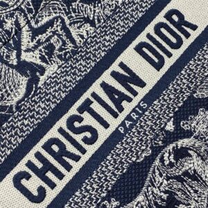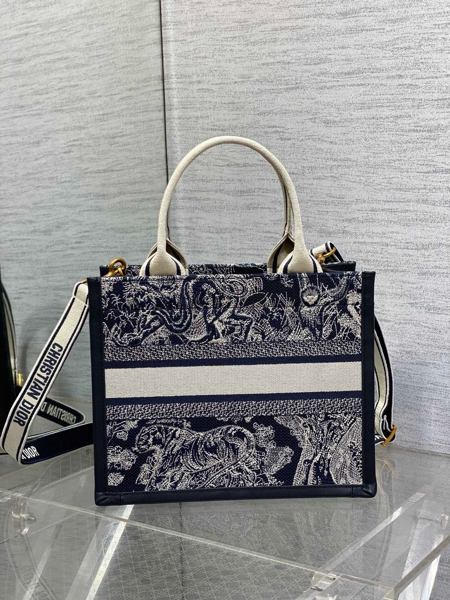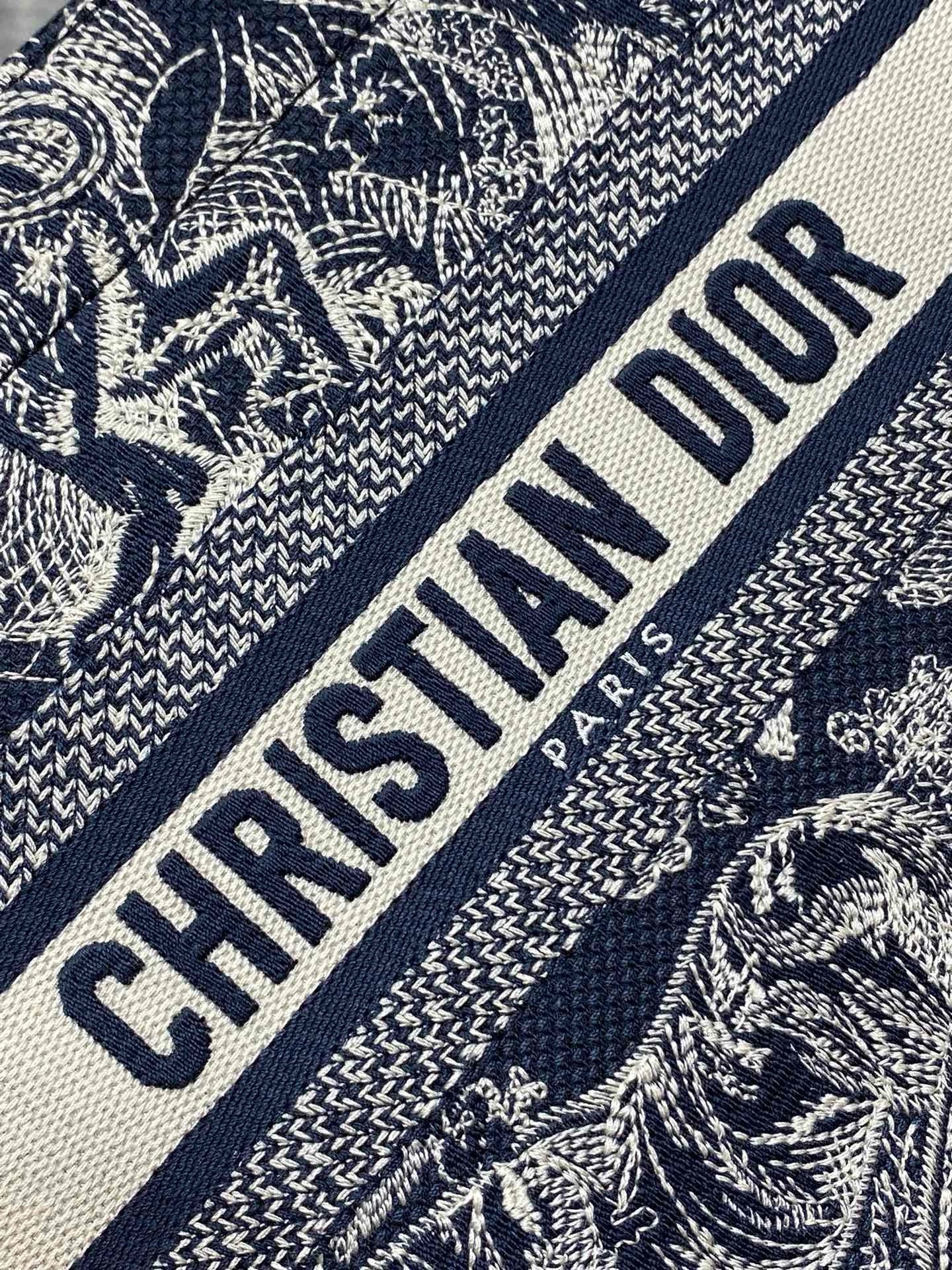 Dior Small Book Tote Bag with Strap in Toile de Jouy Reverse Embroidery and Blue Calfskin