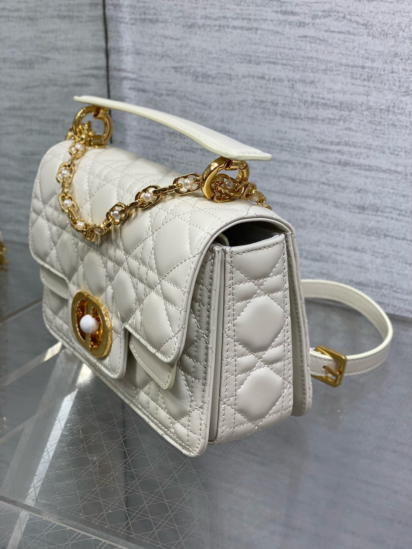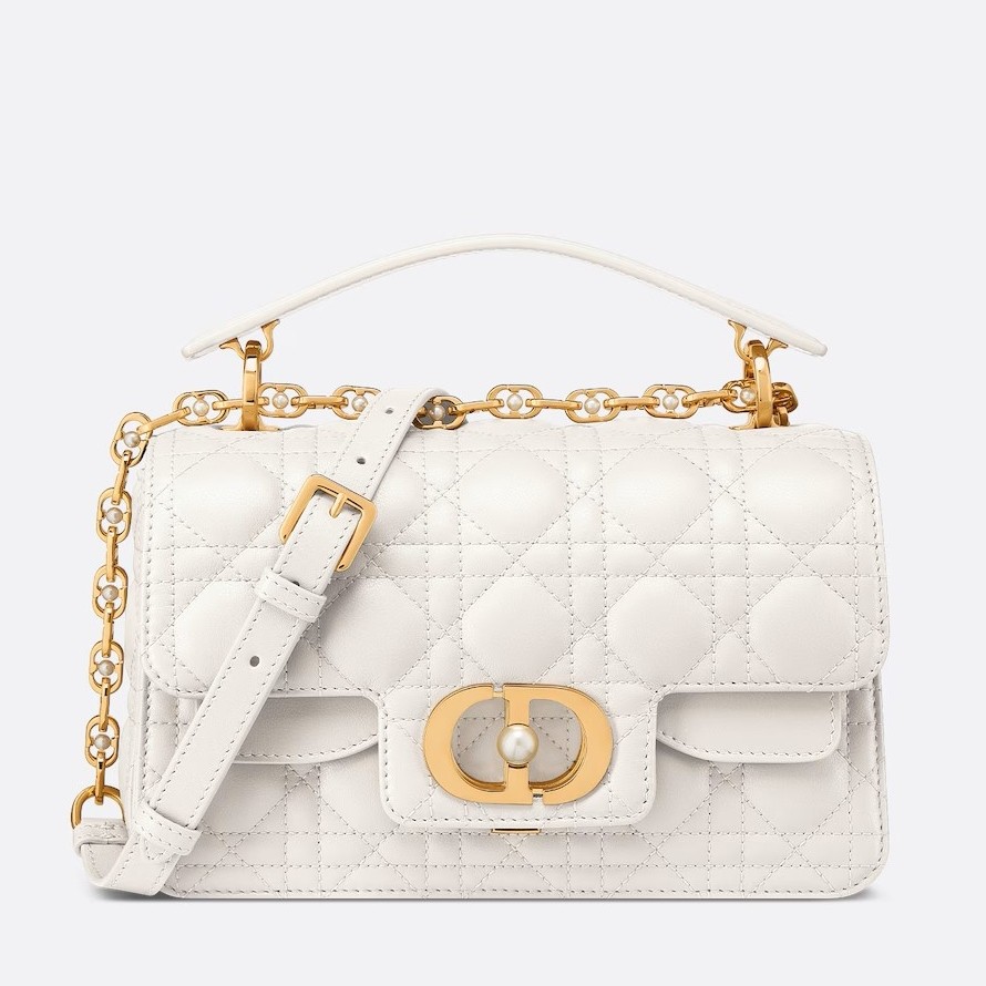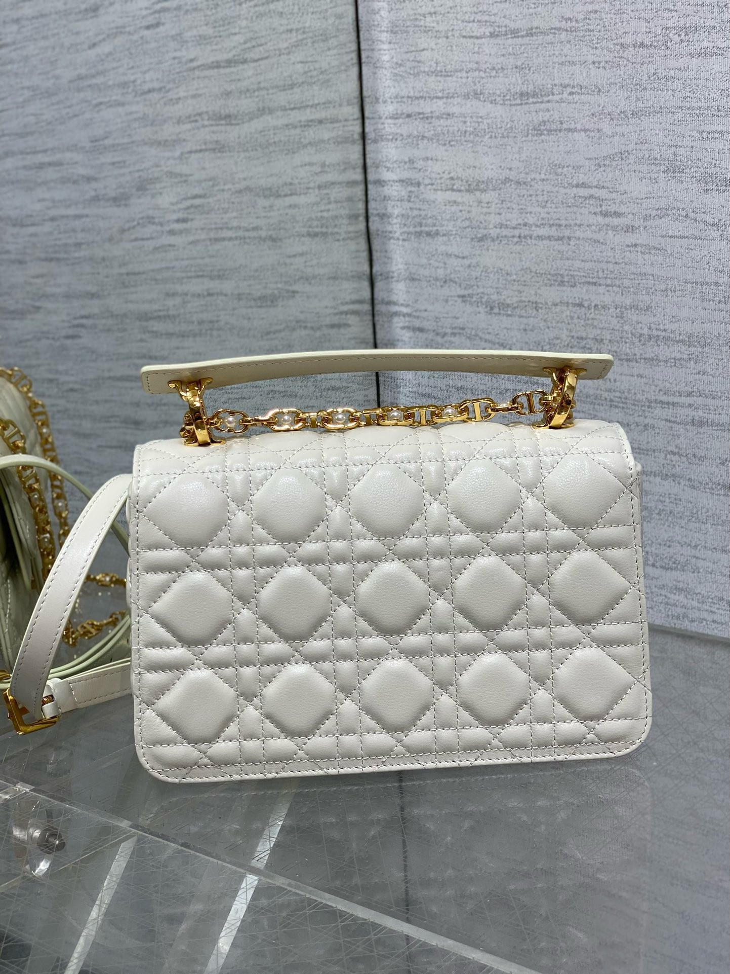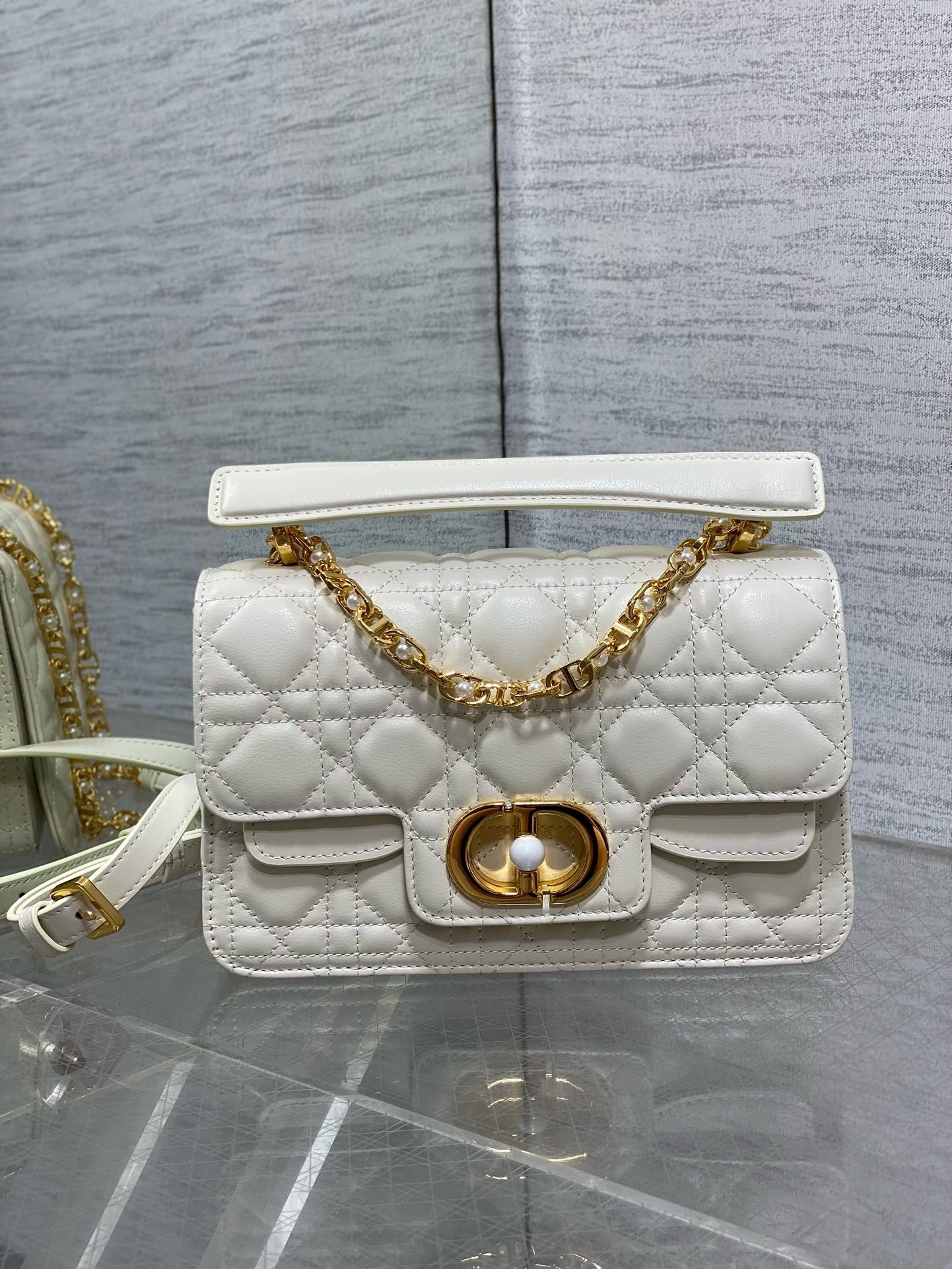 – Removable and adjustable chain shoulder strap with white resin pearls and leather insert