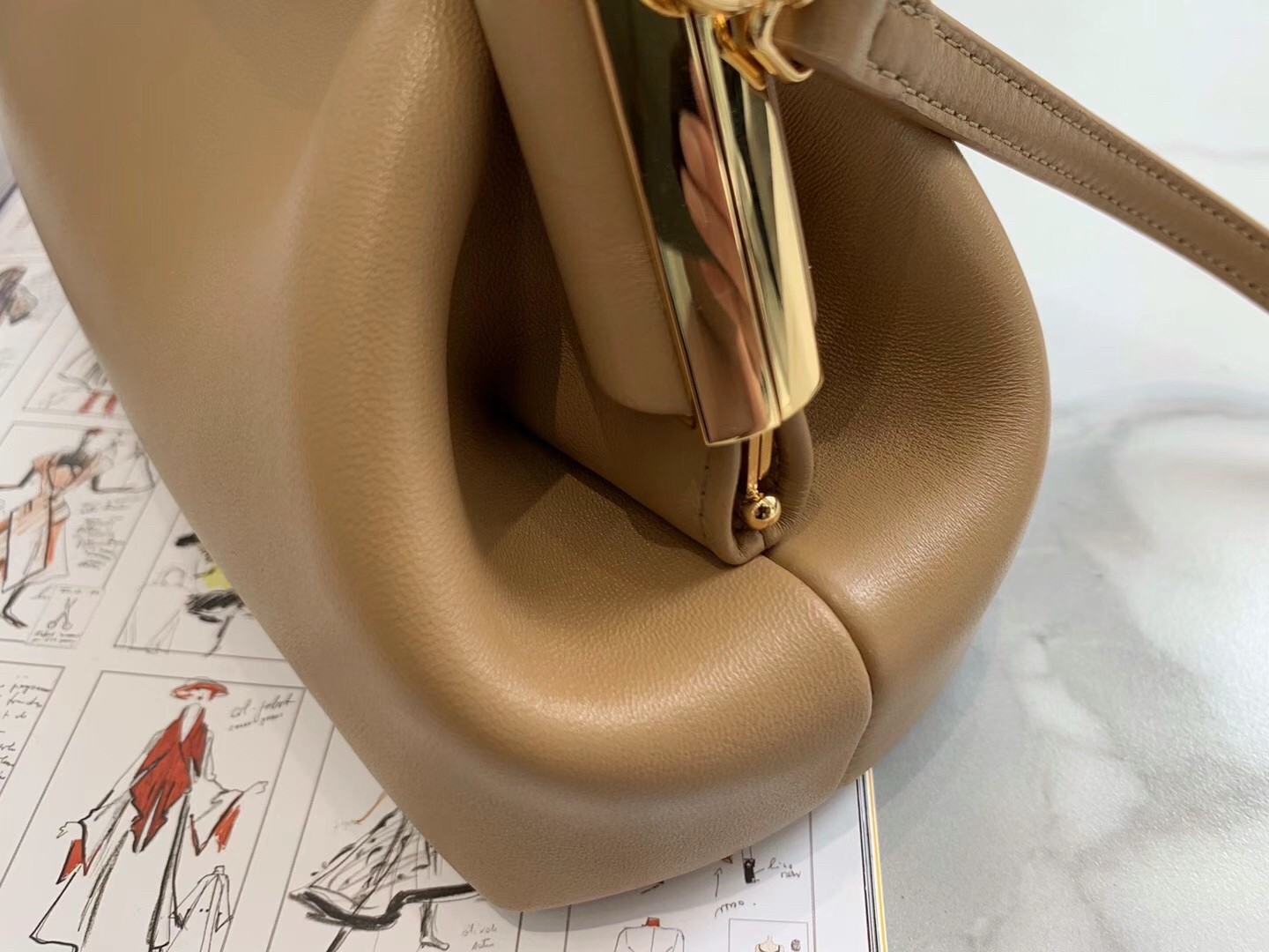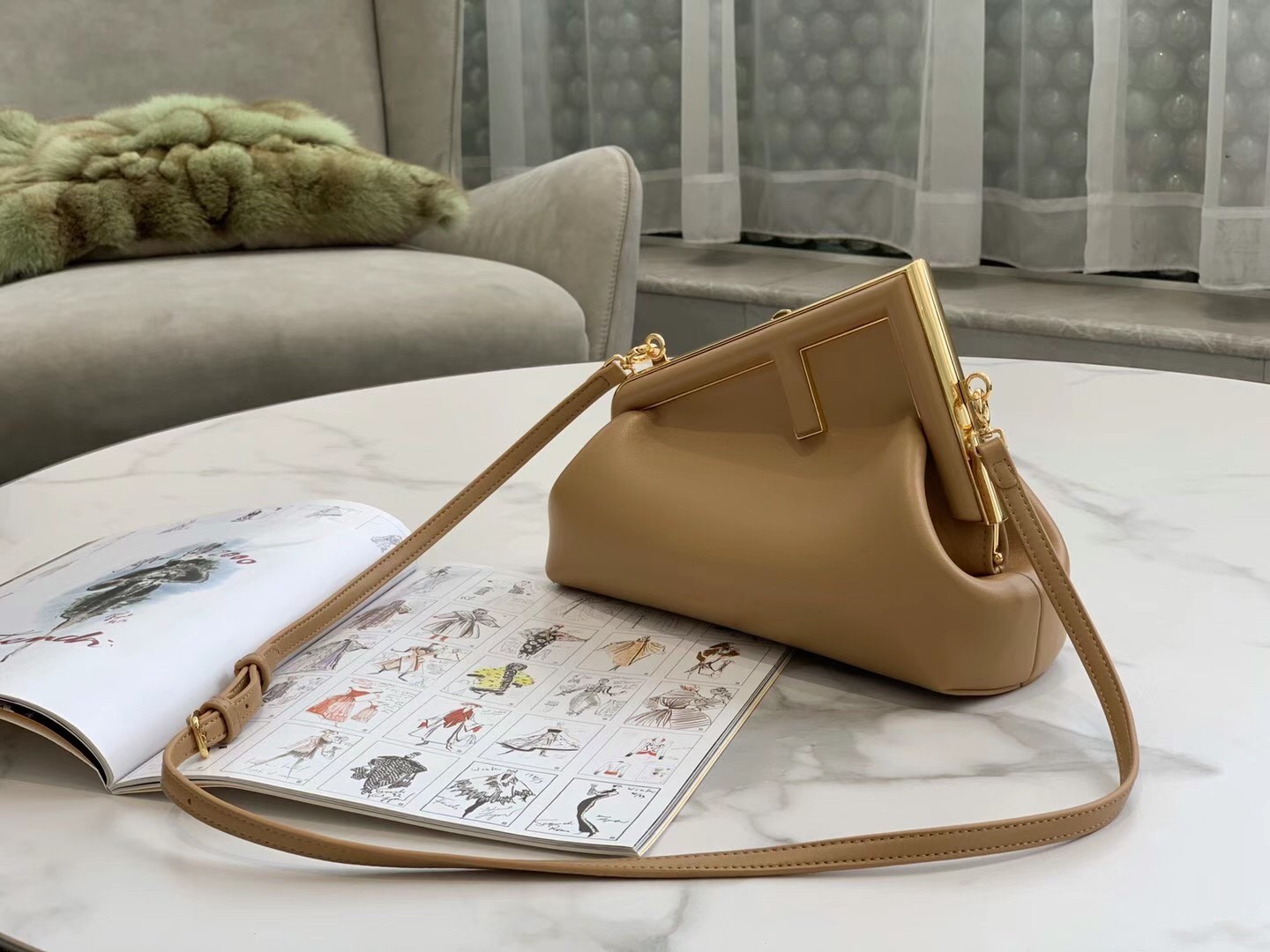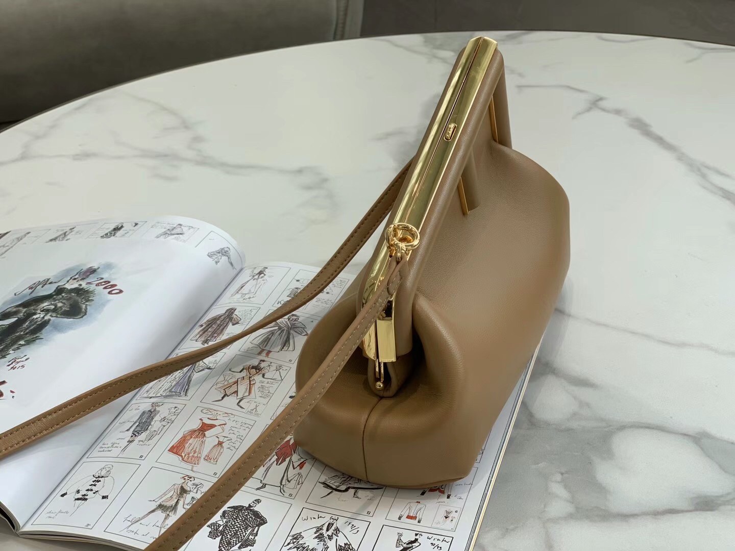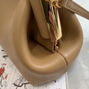– Oversized metal F clasp bound with tone on tone nappa leather