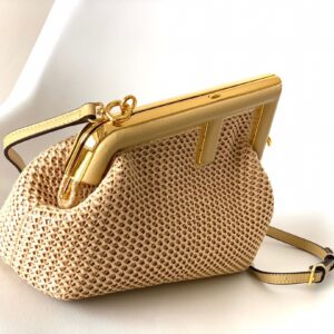 – Oversized metal F clasp bound with beige nappa leather