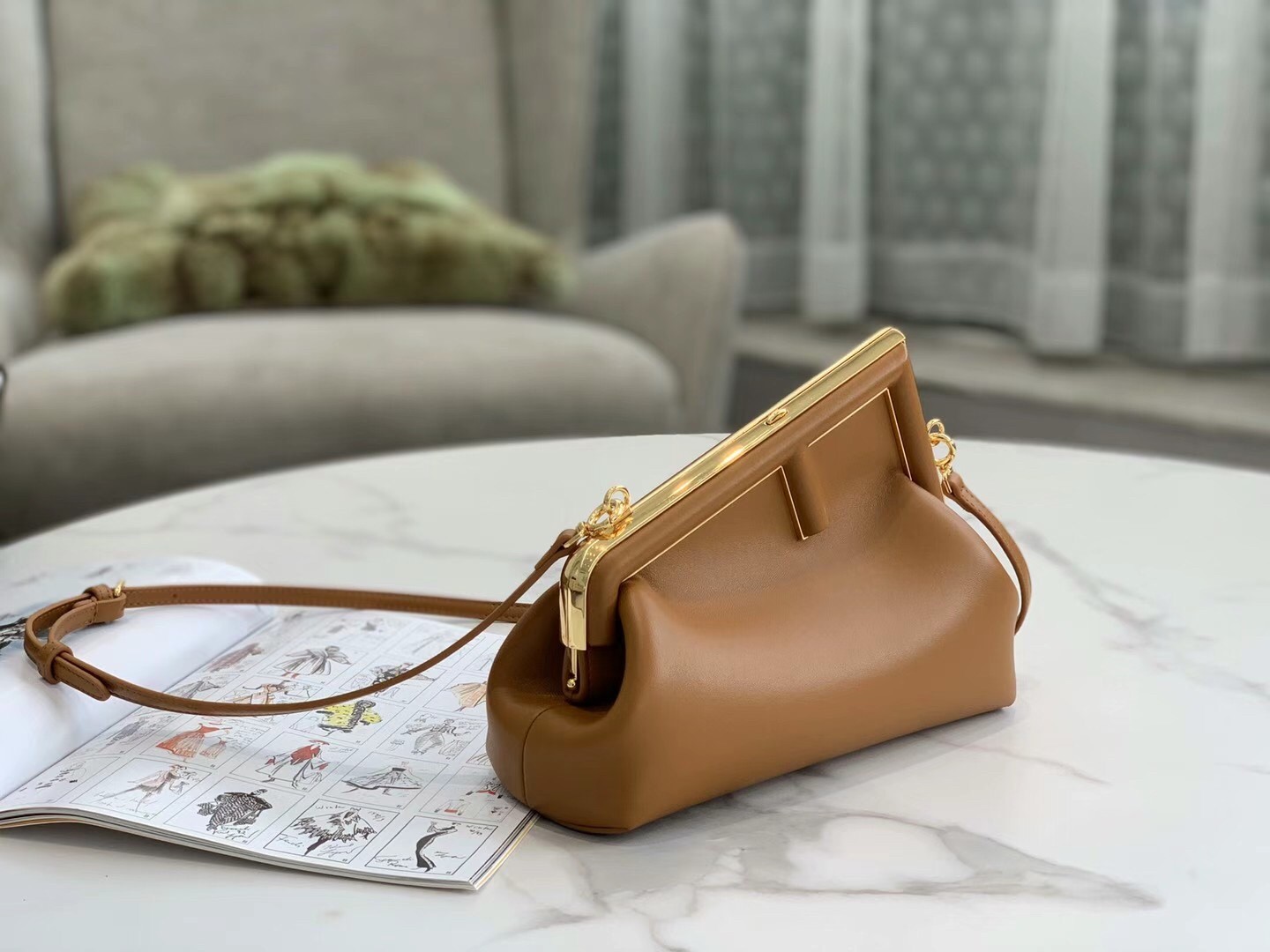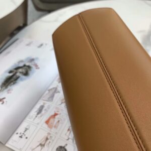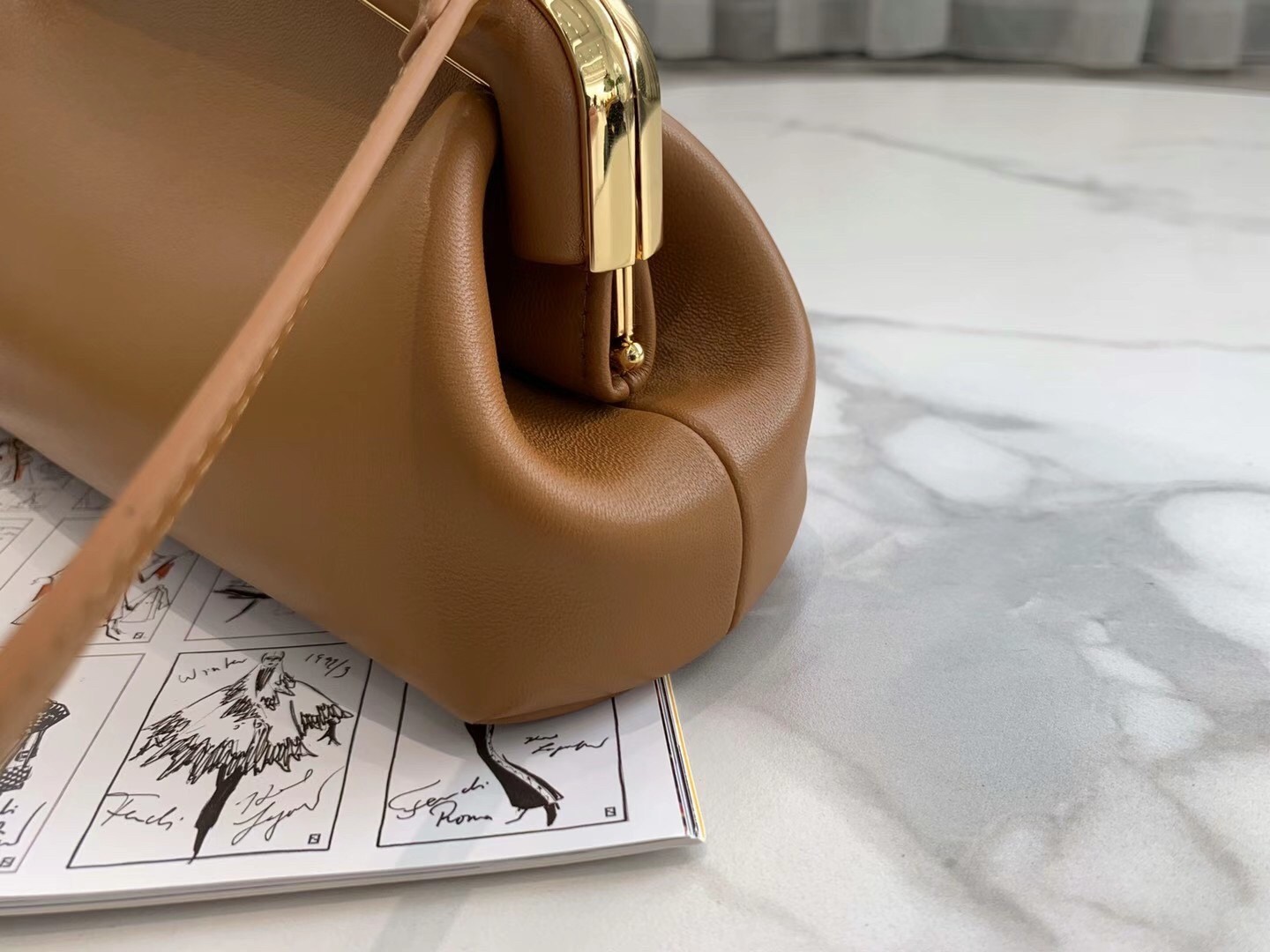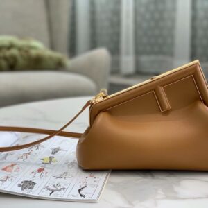 – Oversized metal F clasp bound with tone on tone nappa leather