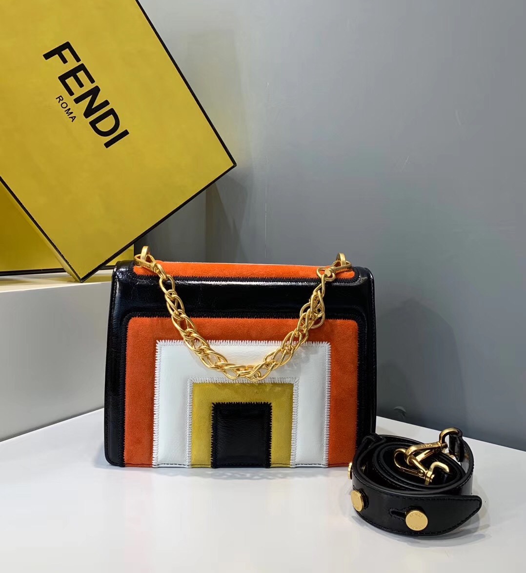 – Geometric flap with embossed corners and an iconic FF press-stud fastening