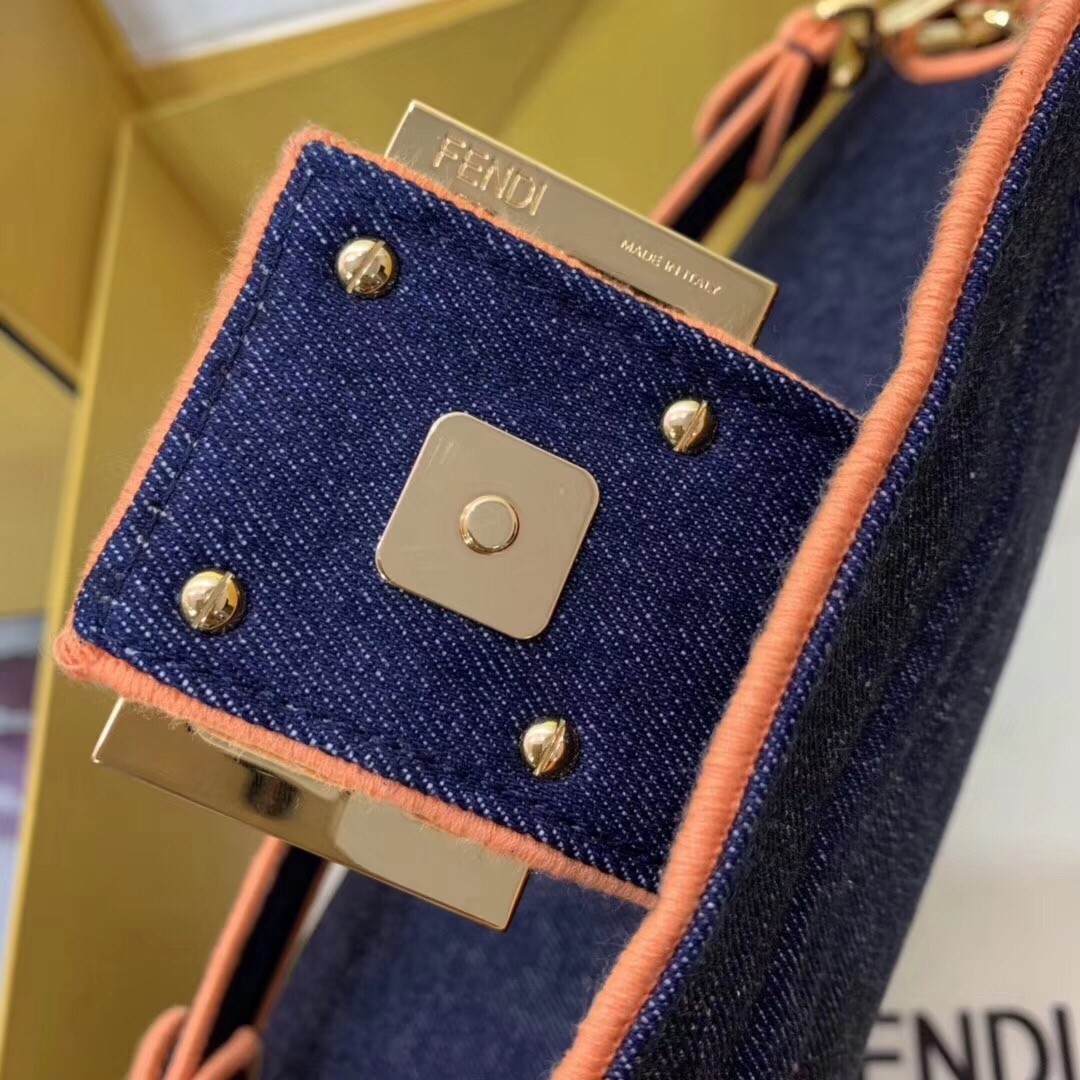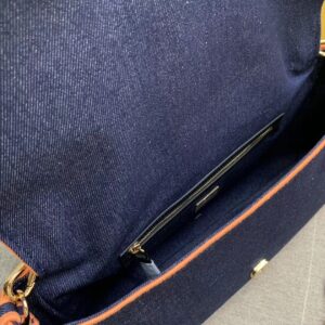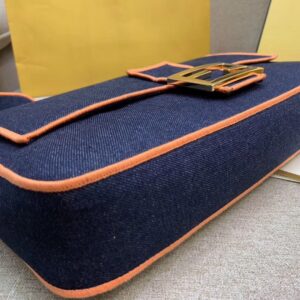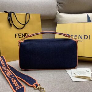 Fendi Large Baguette Bag In Blue Denim With Orange Trim