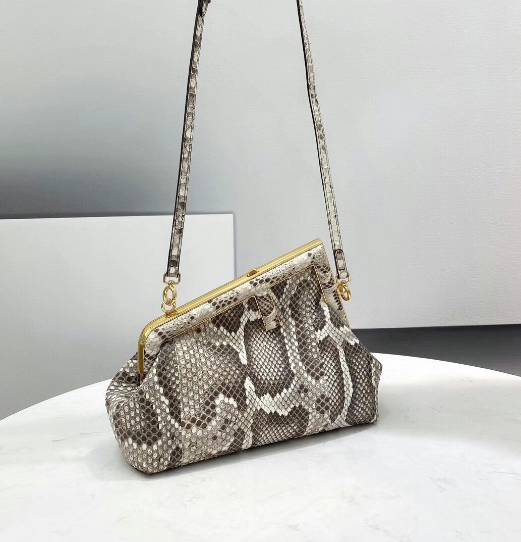 – Oversized metal F clasp bound with tone on tone nappa leather