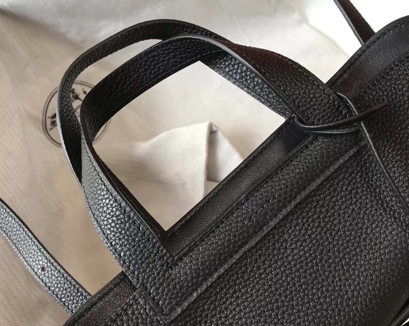 – Two short flat leather handles with 10 cm drop