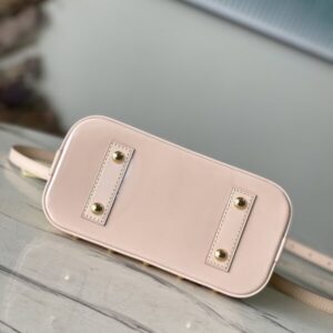 Alma BB handbag is made of glossy Monogram Vernis leather to create a chic Art Deco style structure, with cowhide leather handles and lower edge. Metal rivets embellish the handle fixing position and bottom trim, and the bright hair clip adds a trendy touch.