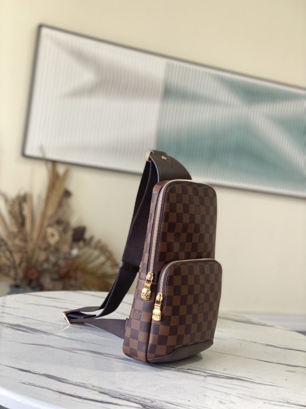 AVENUE Shoulder Bag Chest Bag in Damier Graphite canvas This Avenue shoulder bag in Damier Graphite canvas is the perfect companion for urban life. Small and stylish, it shows a casual and unruly attitude. The “smart” shoulder strap design fits on the left or right shoulder The double zipper closure on the back keeps valuables secure! ‘
