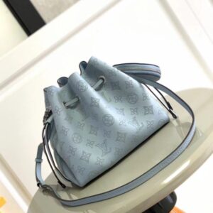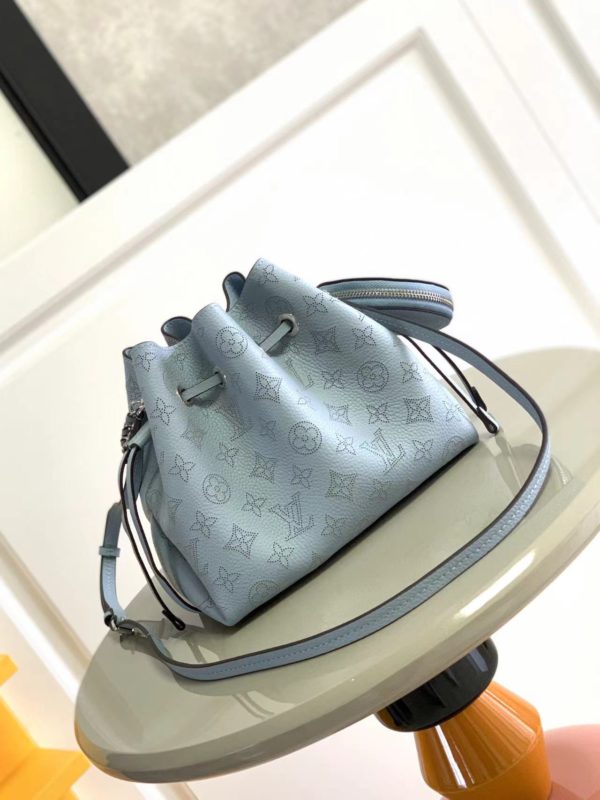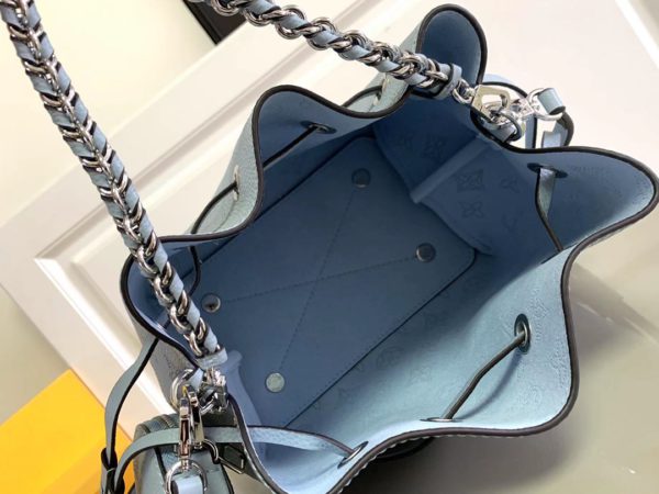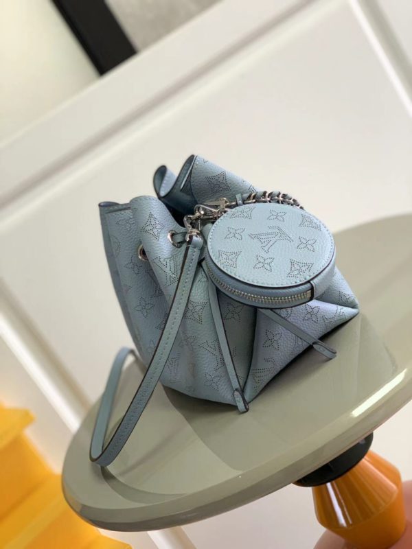 Light blue BELLA handbag Bella bucket bag is made of Monogram perforated calfskin to create a small shape, and then make the same pattern live in a round coin purse in a pocket scale, full of modern style. Braided metal and leather handles and a detachable leather shoulder strap allow for versatile carrying options.