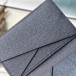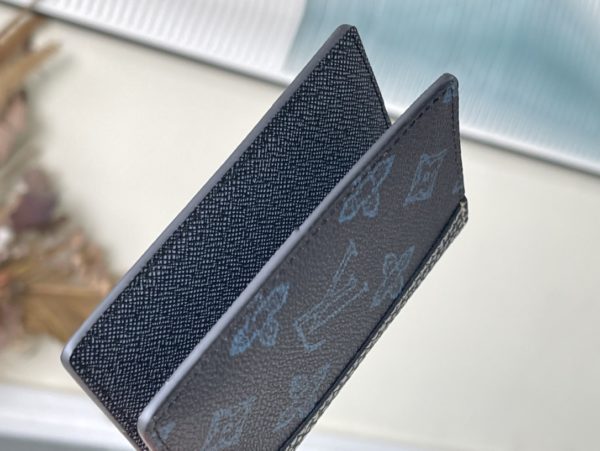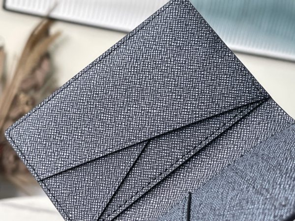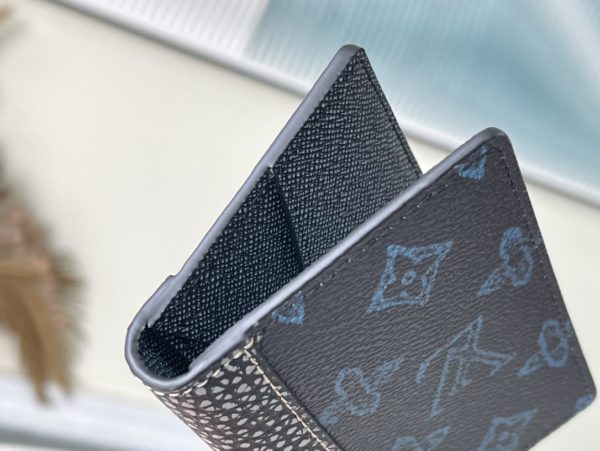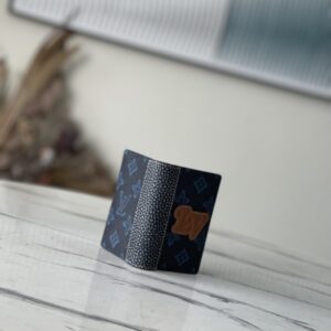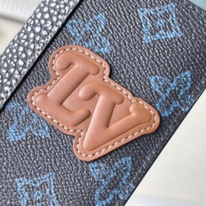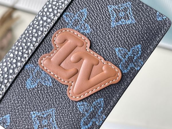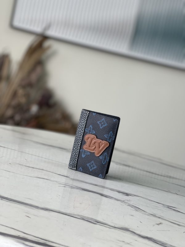 This pocket wallet wallet is made of canvas with a blue pattern on a dark background, the canvas is stitched with a leather patch in the shape of a logo with brown stitching, and the trim is presented with the same stitching . The wallet is compact enough to fit in most clothing pockets.