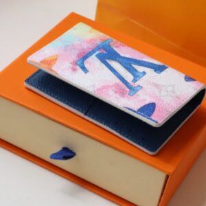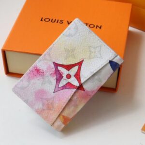 Representing the Monogram on canvas submerged in soft watercolor tones, it fits in most pockets while storing credit cards, bills, and receipts.