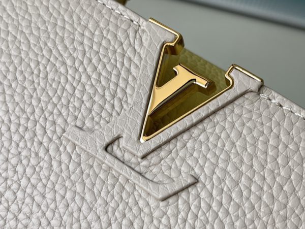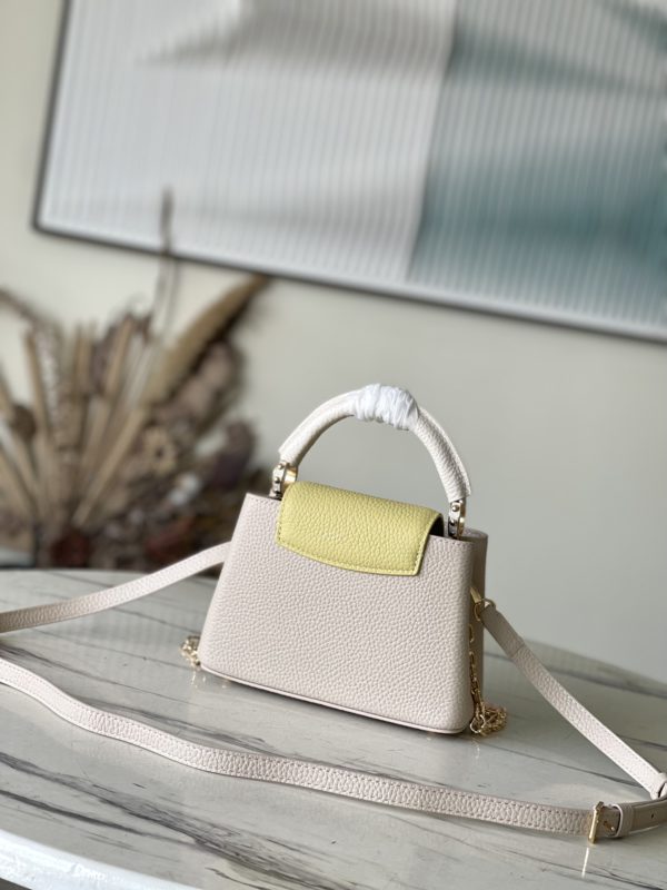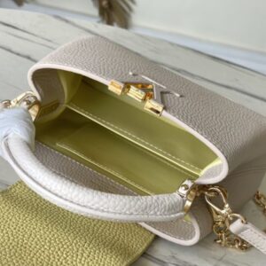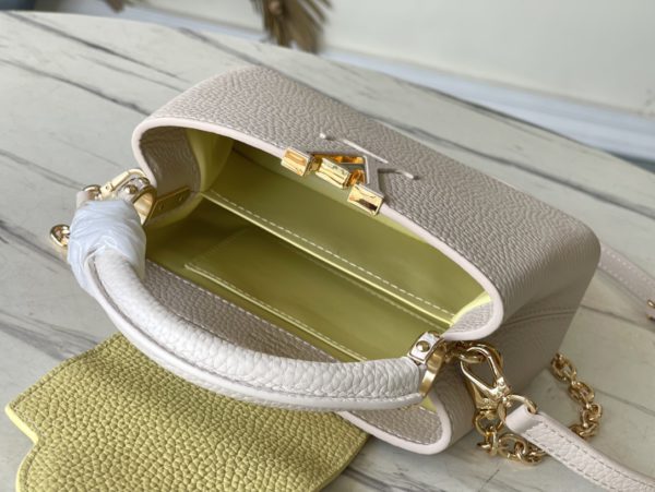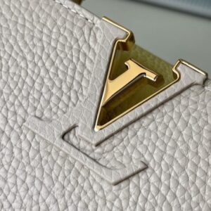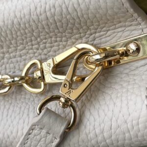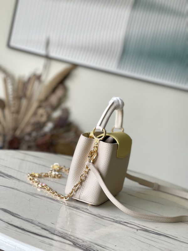 This Capucines handbag is made of Taurillon leather, which faintly reflects the shades of the same color, making the classic shape more eye-catching. Matched with the enamel Monogram floral chain, it can be carried by hand, on the elbow or on the shoulder strap.