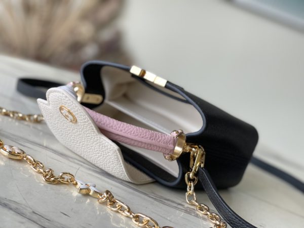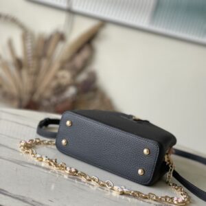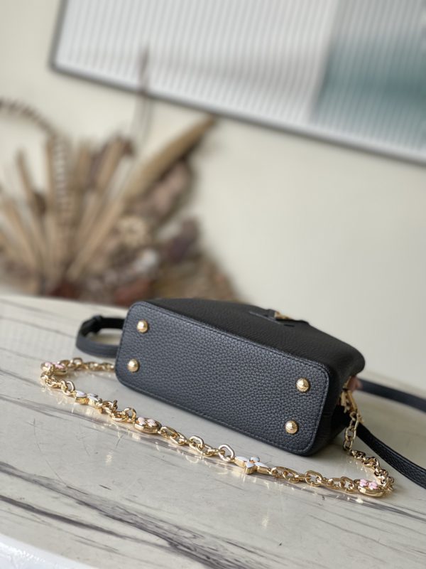 This Capucines handbag is made of Taurillon leather, which faintly reflects the shades of the same color, making the classic shape more eye-catching. With the enamel Monogram floral chain, it can be carried by hand, on the elbow, or on the shoulder strap.